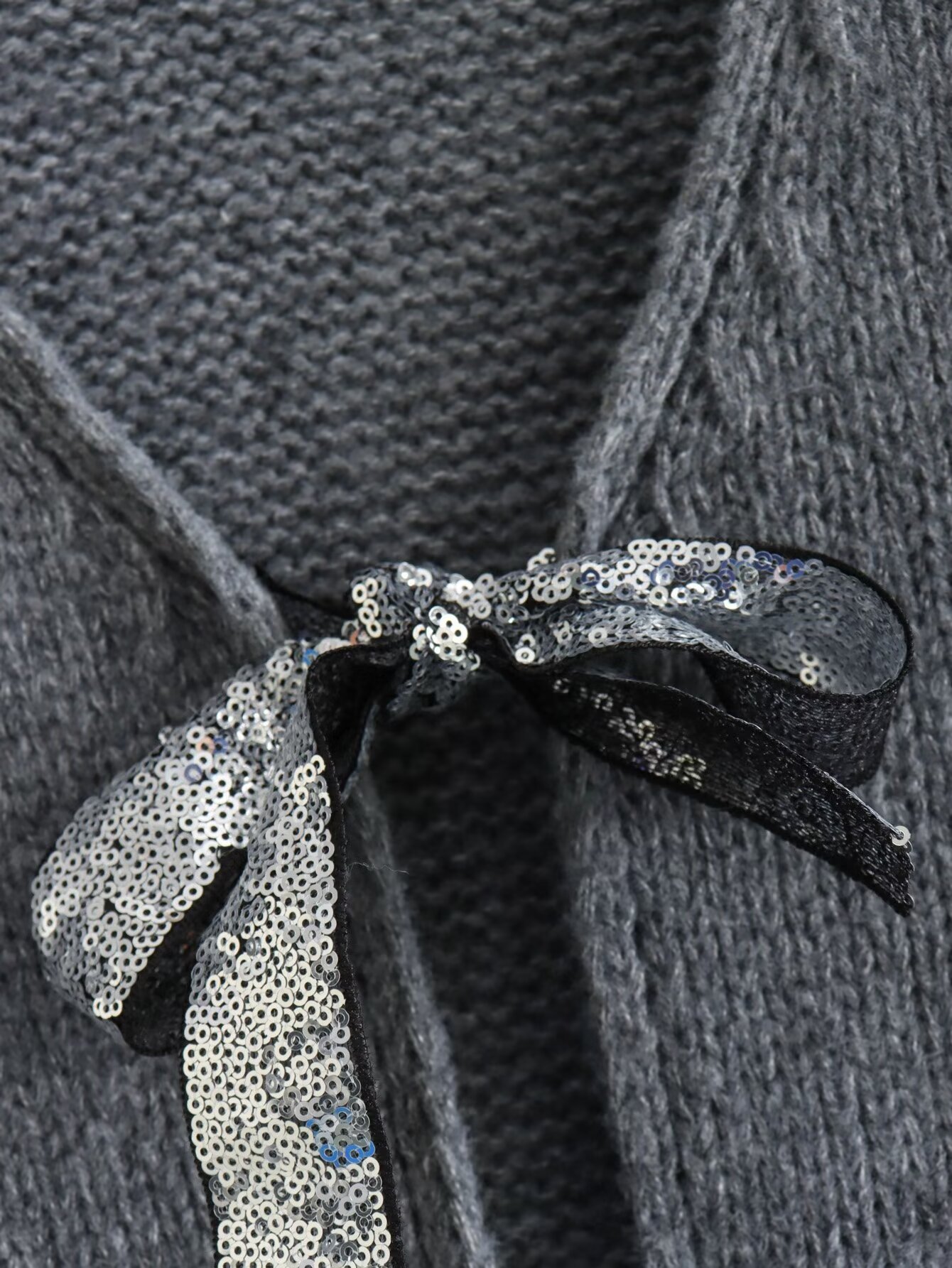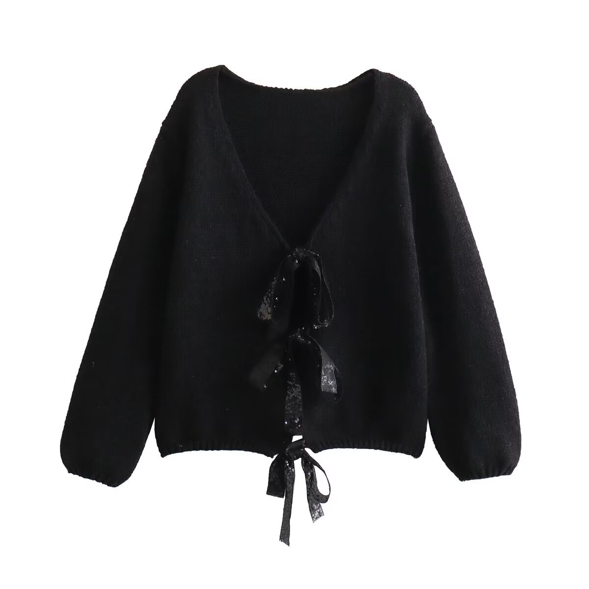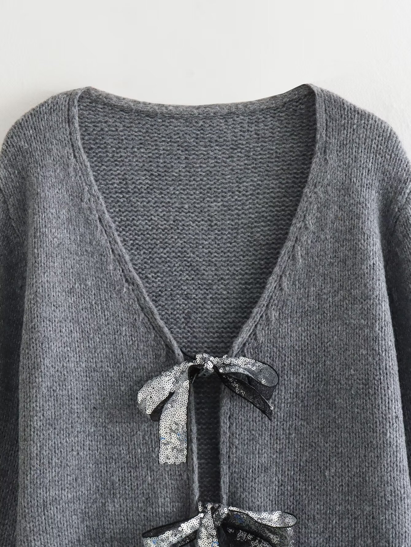V-neck Long Sleeve Sequined Bow Tie Knitted Cardigan Sweater