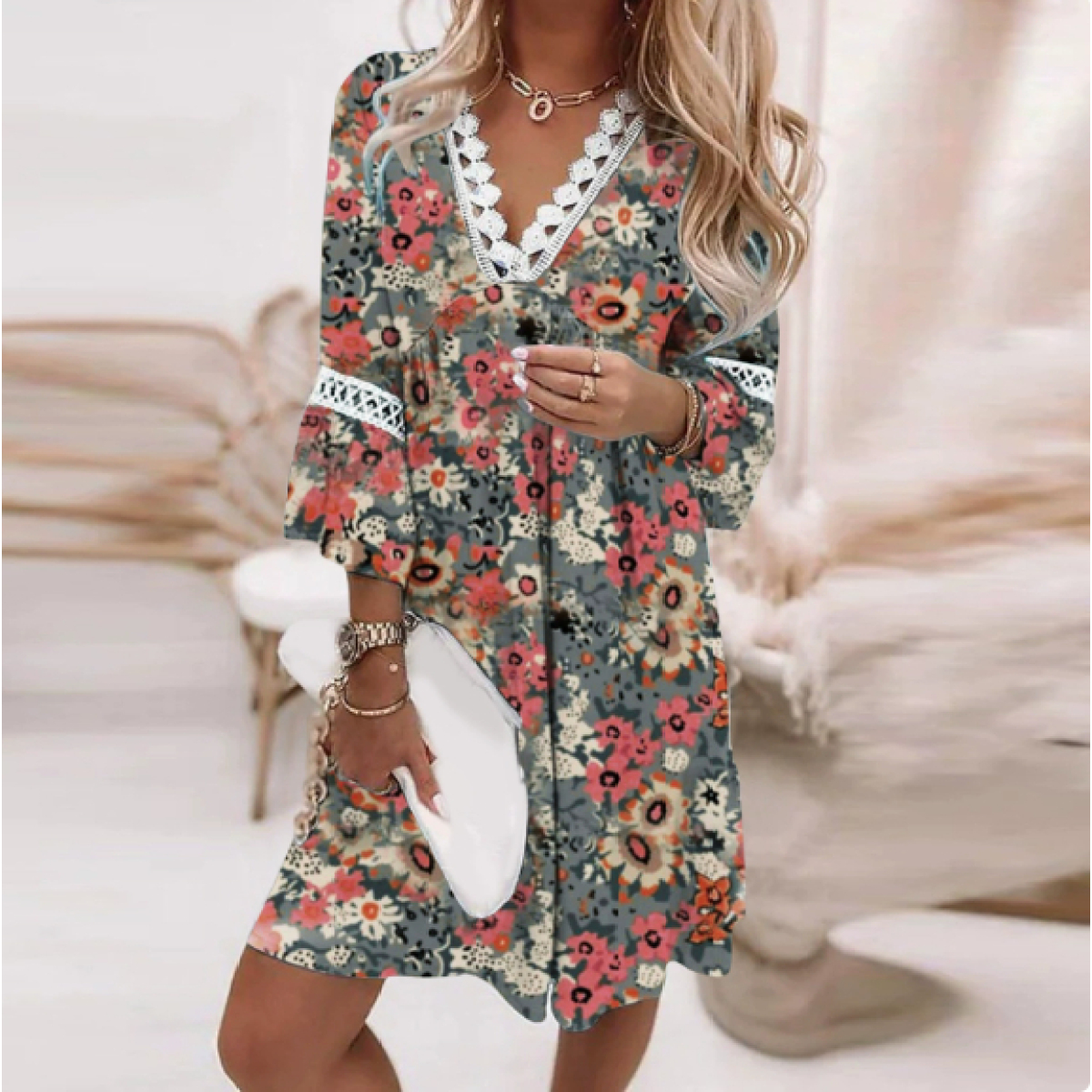 V-neck Printed Lace-Patchwork Bohemian-Style Casual Dress