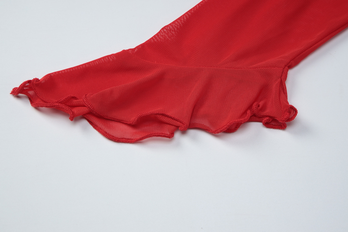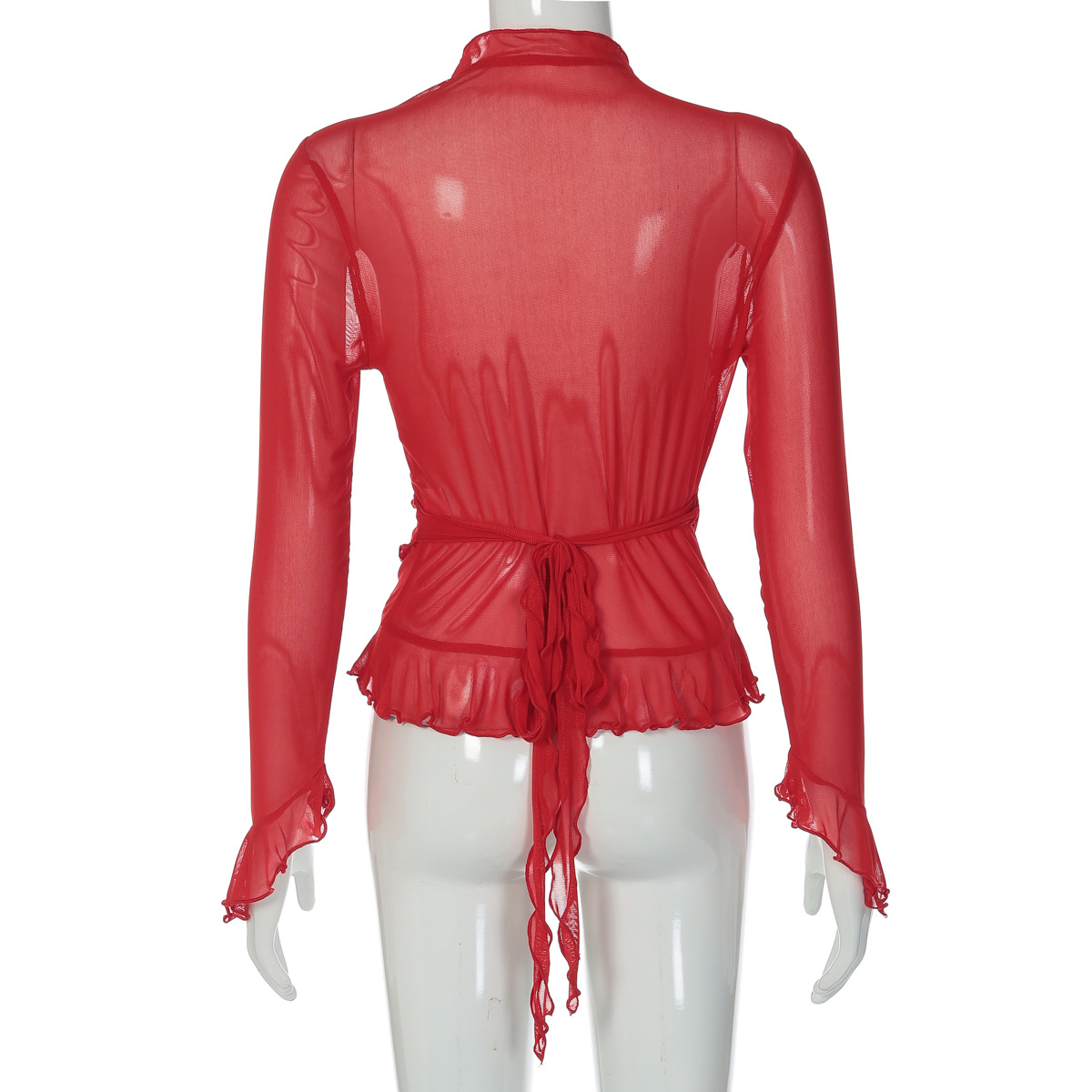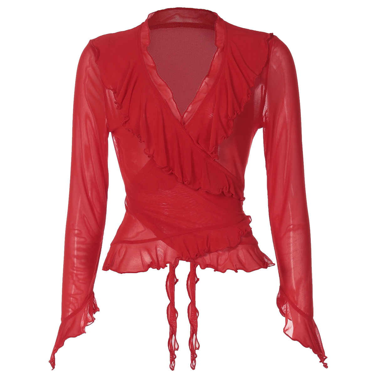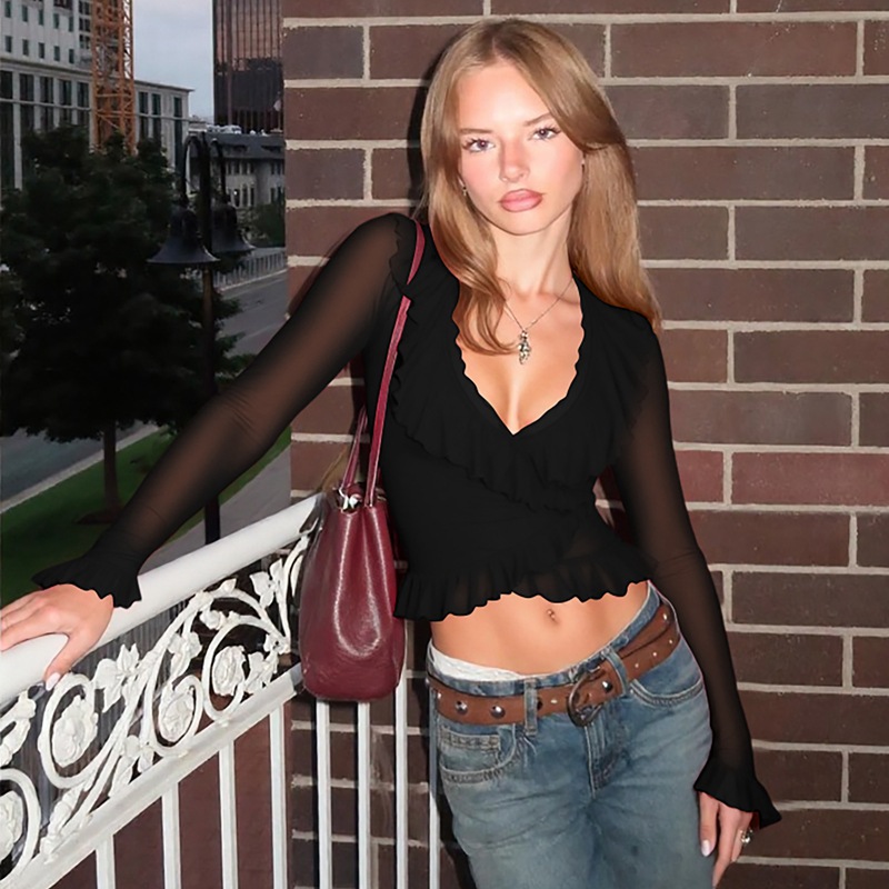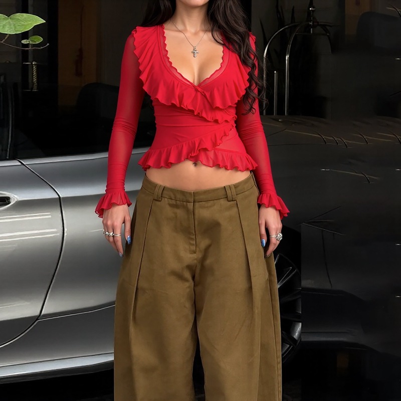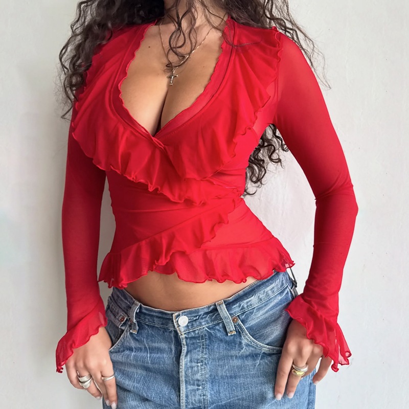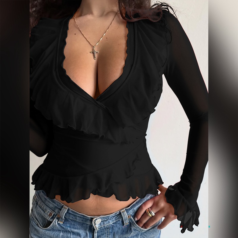 V-neck Ruffled Slim-fit Flared Long-sleeve Top
