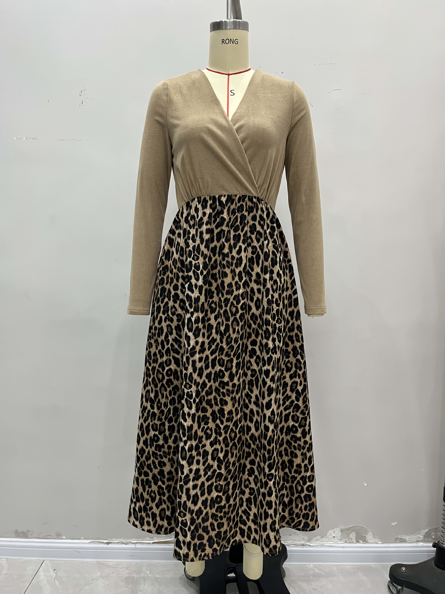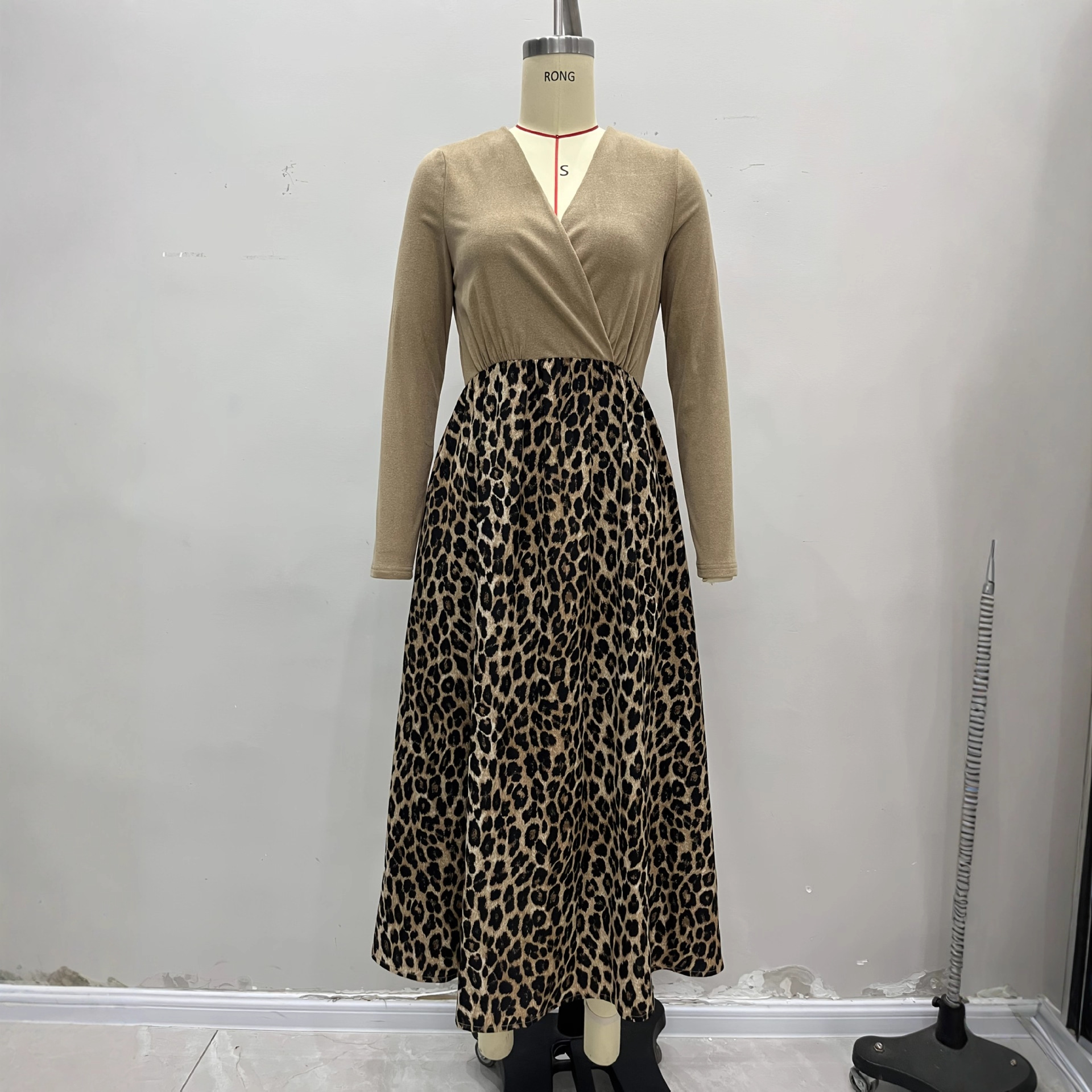 V-neck Spliced Drapey Fabric Leopard Print Long-Sleeve Dress