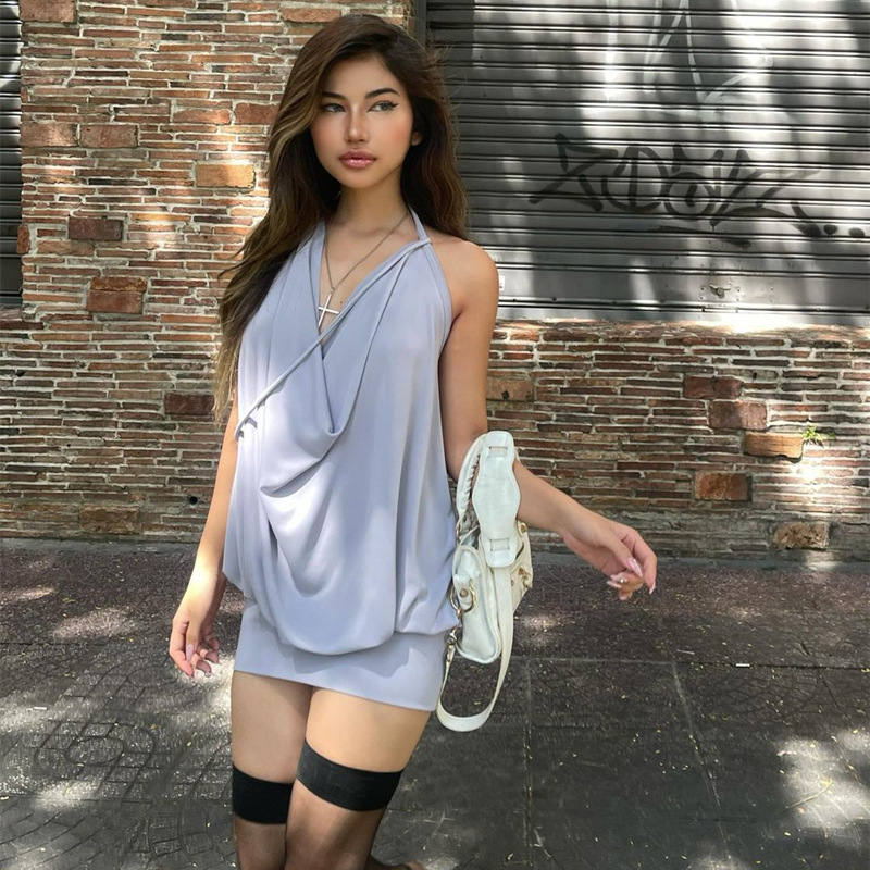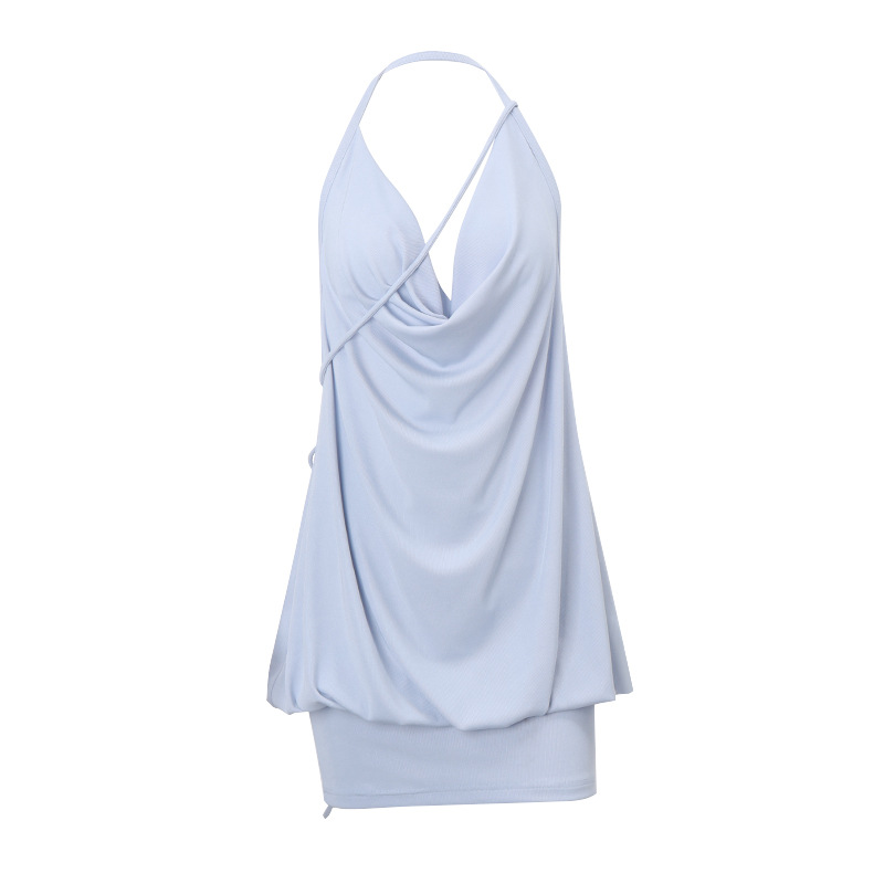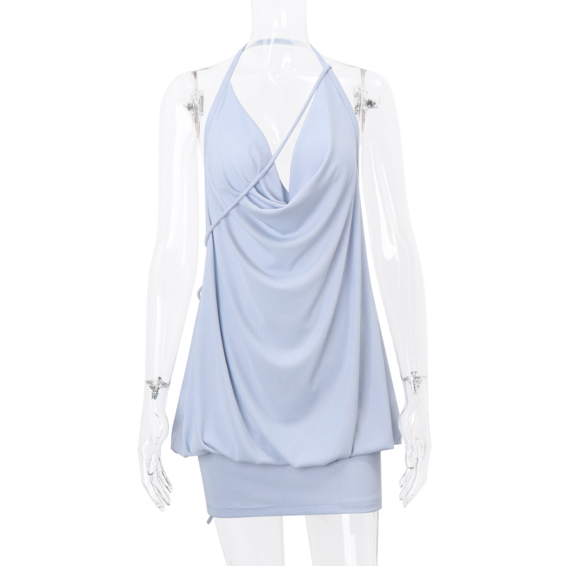 V-shaped Swing Collar Pleated Backless Lace Up Sheath Halter Dress