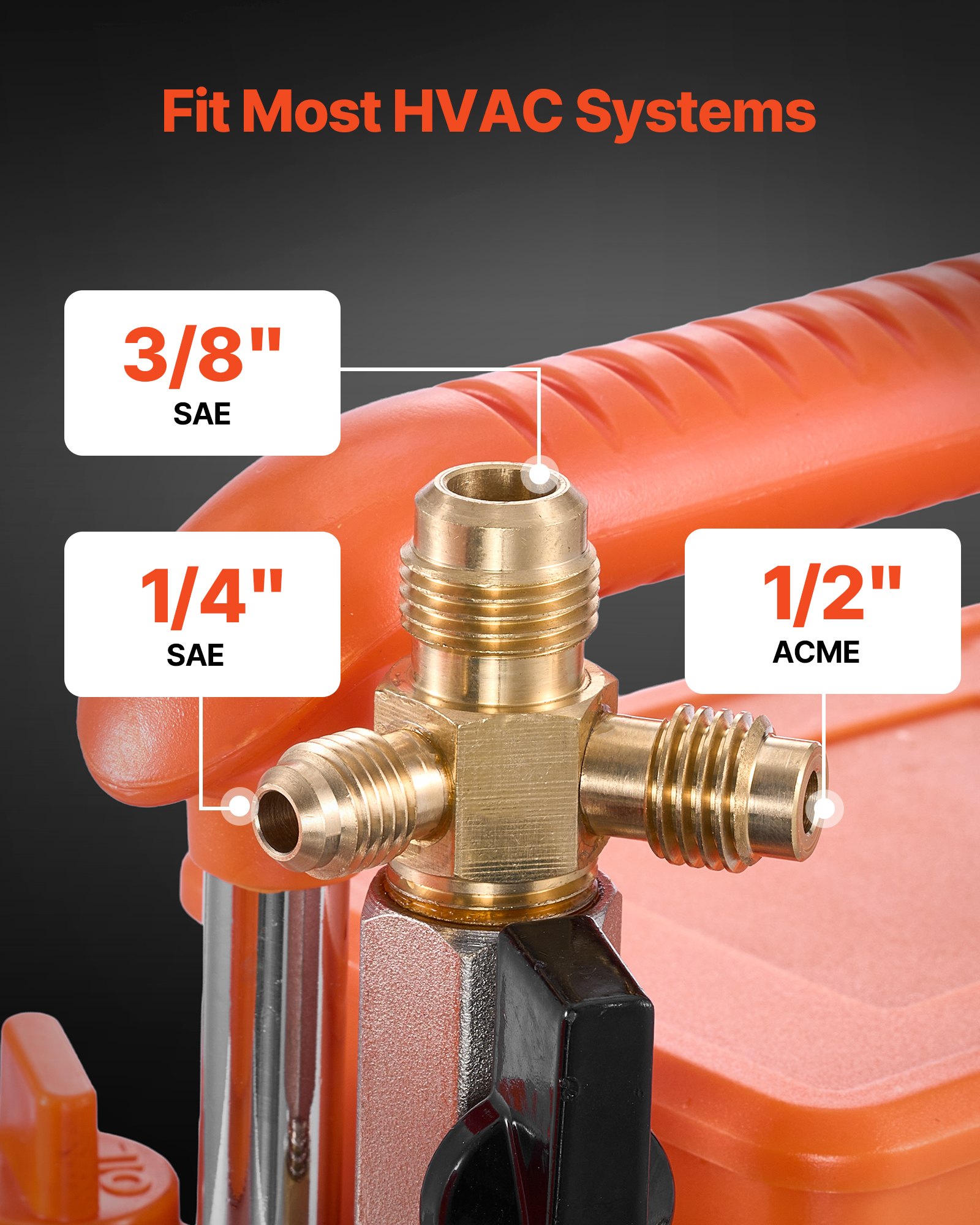 Excellent Compatibility: Equipped with 1/4-inch SAE, 1/2-inch ACME, and 3/8-inch SAE air inlet ports, this vacuum pump easily connects to automotive A/C systems and small R134a, R22, R410a, R1234YF, and R32 refrigerant systems