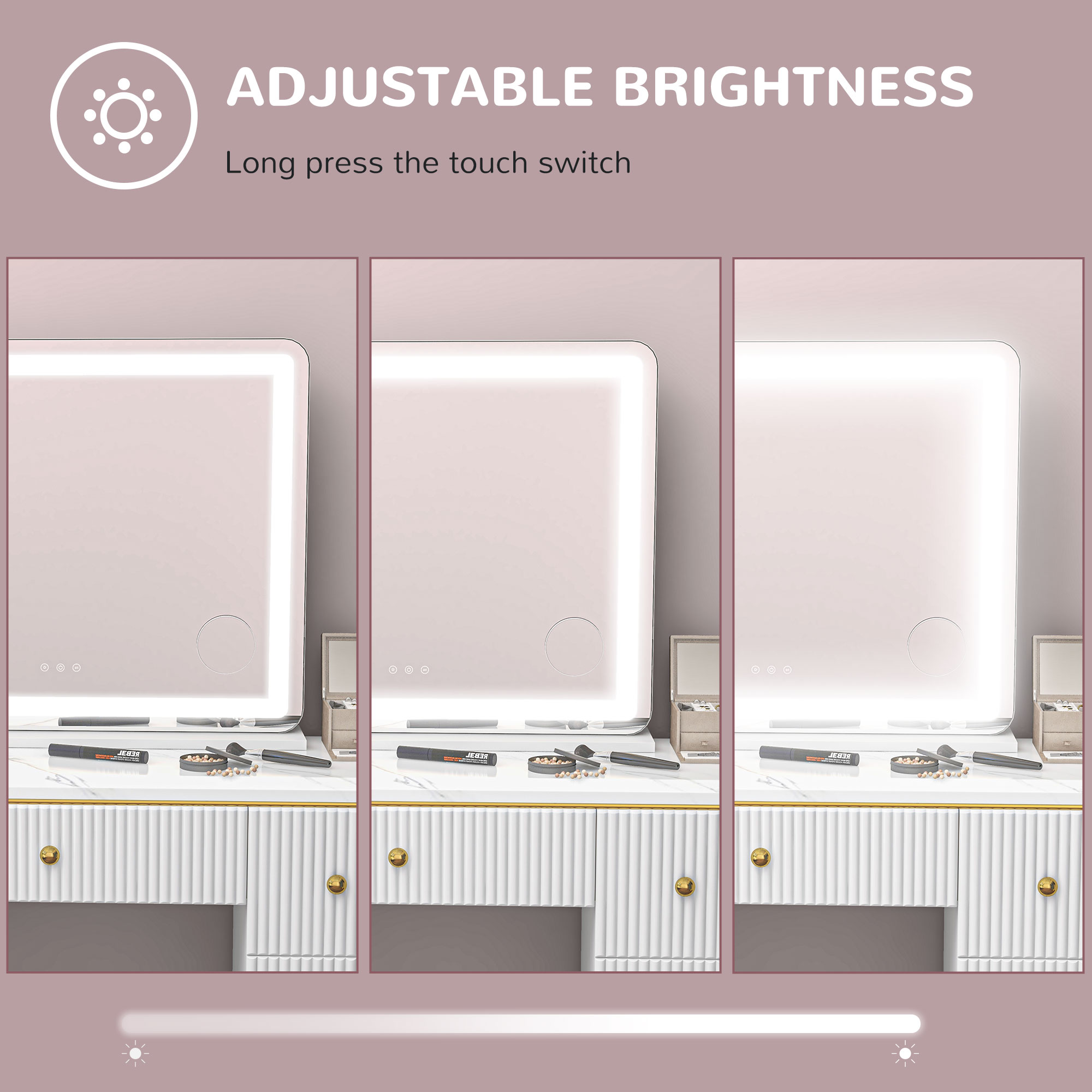Discover a flawless reflection with the LED vanity mirror. Its expansive size ensures your entire face is visible, while the enduring 50,000-hour LED lifespan brightens your beauty routine. Charge your gadgets with the convenient USB port and switch between warm, cool, or natural light to improve your look, all with a simple touch.