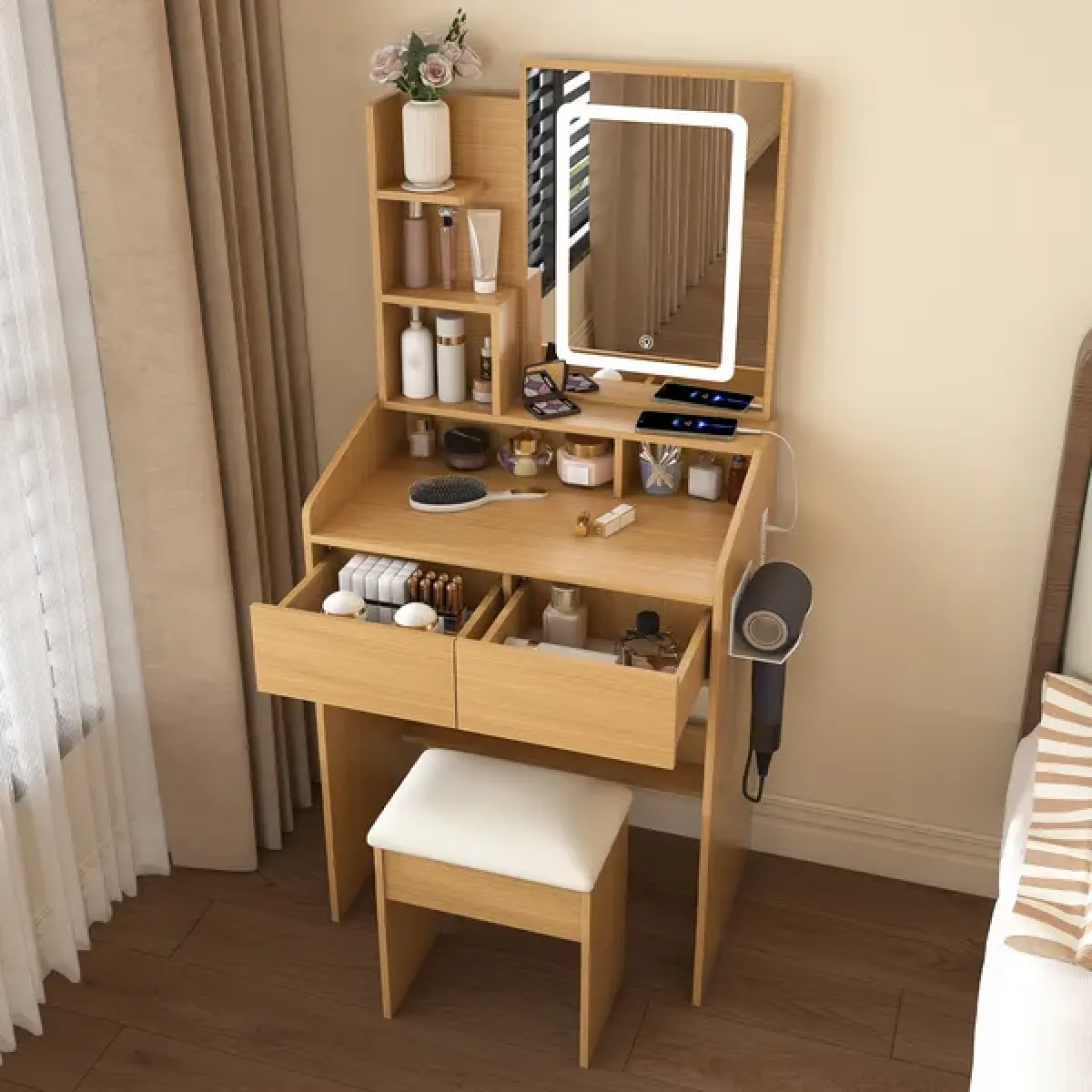 [Convenient Power Integration]Equipped with a power socket and a dedicated hairdryer holder, you can charge your device while using beauty tools such as straighteners or curling irons. [Smart Storage Design]Includes two spacious drawers and open shelf to organize cosmetics, jewelry, and accessories, keeping your space clutter-free. [3-Level Adjustable LED Lighting]Features 3 color temperatures (warm/neutral/cool) with dimmable brightness, providing ideal illumination for precise makeup application and skincare routines. [Comfort Included]Comes with a padded soft stool for comfortable seating, enhancing your daily beauty routine without extra purchases. [Space-Saving Perfect Fit]Compact dimensions optimized for small bedrooms, apartments, or dorms, maximizing functionality without sacrificing style. [Stylish and Versatile]Crafted in a modern wood finish with durable construction, easily blending with any decor; includes detailed illustrated instructions, numbered panels, and an instructional video for easy installation in 60-90 minutes