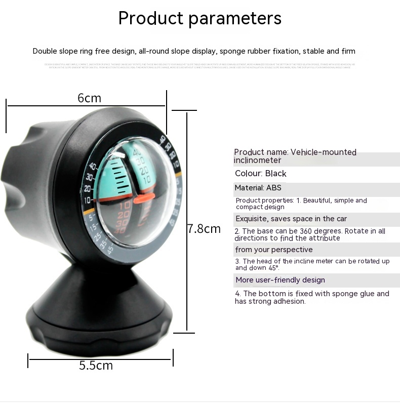 Measure the inclination and elevation angles of the car, as well as the changes in the left and right rotation angles of the vehicle body. The vehicle mounted slope meter adopts a free type rotation, which has high sensitivity and provides slope and inclination. Understand the road conditions and increase driving safety. Ergonomic design, adjustable perspective, and exquisite workmanship.