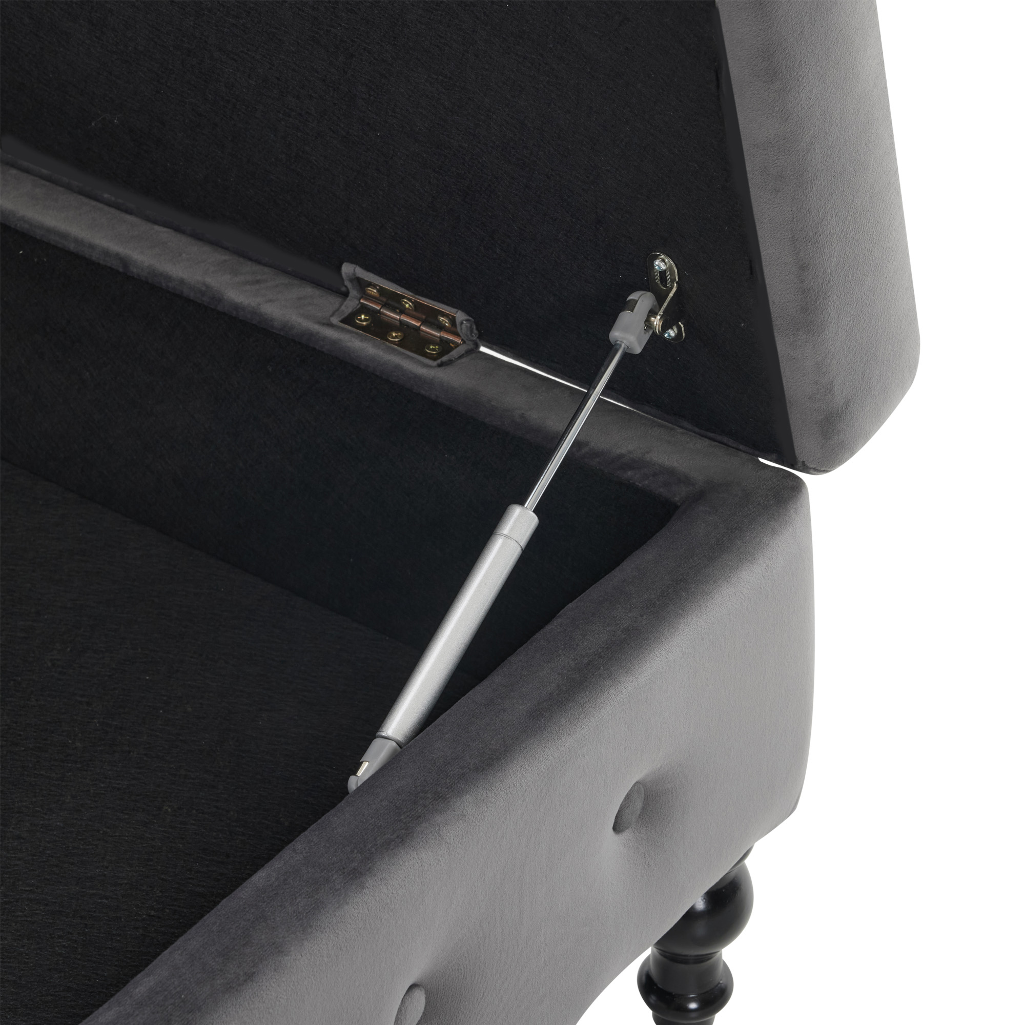 This velvet chaise lounge exudes luxury and elegance with its rolled armrest and dramatic downward-sloping back. The lumbar-supporting pillow enhances your relaxation, while the exquisite button detailing and nailhead trim add a touch of sophistication to any room. Underneath the seat, you'll find a hidden storage space, which is just right for stashing spare blankets and pillows. Crafted from a blend of solid and engineered wood, this right-arm chaise lounge rests on turned legs with a glossy black finish for a glam silhouette we love.