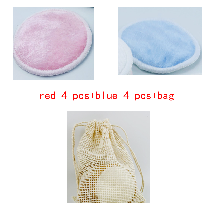 Set includes: 4 red makeup remover cotton, 4 blue makeup remover cotton, 1 cotton mesh bag