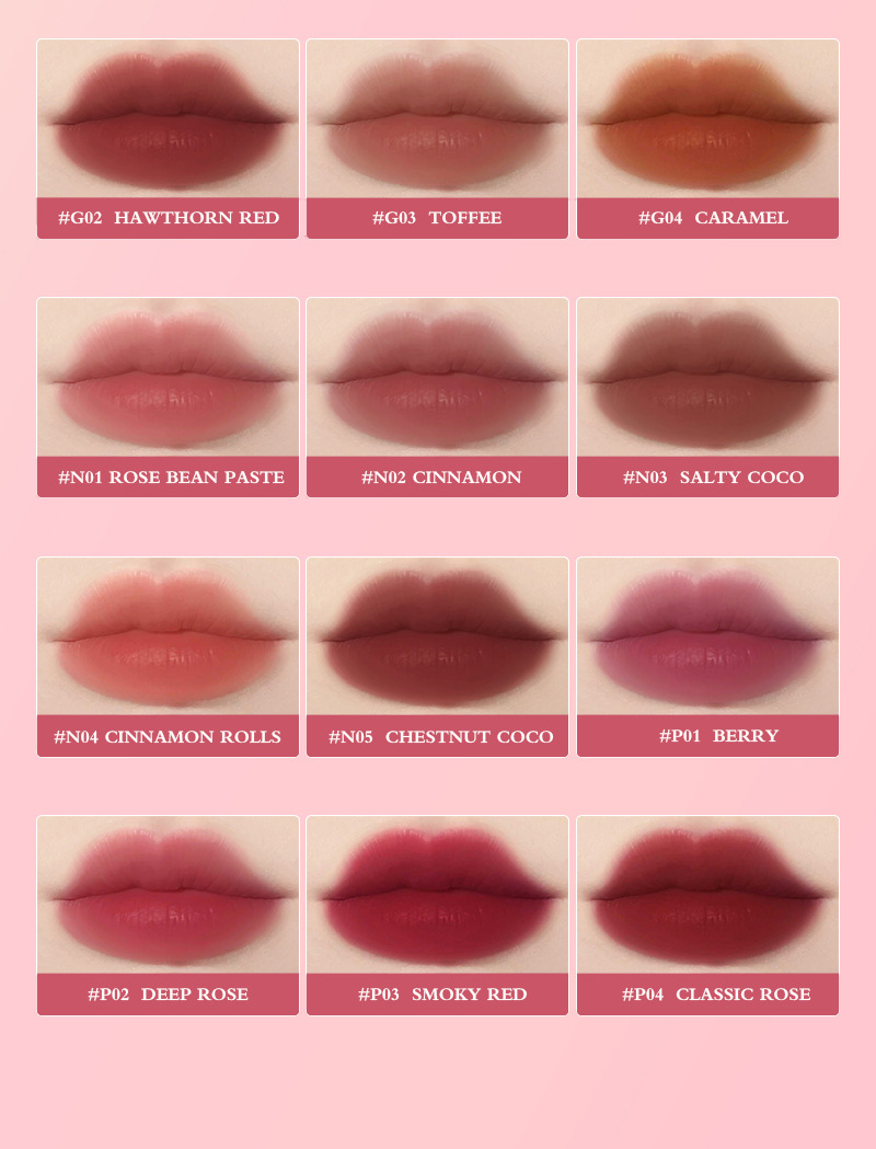 Color: G01# better orange, G02# Hawthorn red, G03# toffee, G04# caramel, N01# rose cameo Brown N02# cinnamon, N03# salty cocoa, N04# cinnamon roll, n05# chestnut cocoa, P01# Berry, P02# Dark Rose, P03# smoky red, P04# Classic Rose