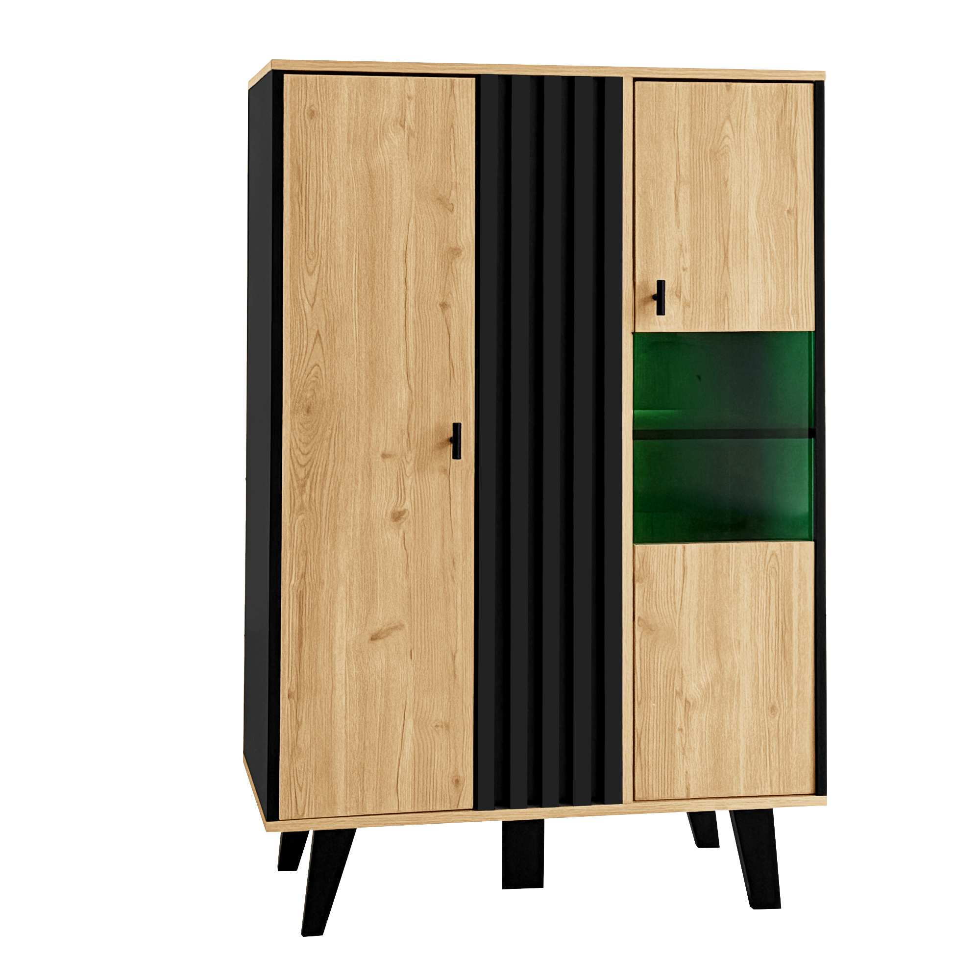 Product Name:Versatile and Modern: Side Cabinets, Sideboards, Display Cabinets with Glass and LED Lighting. Featuring laminates in a combination of black and wood tones, with a unique black wood stripe design.