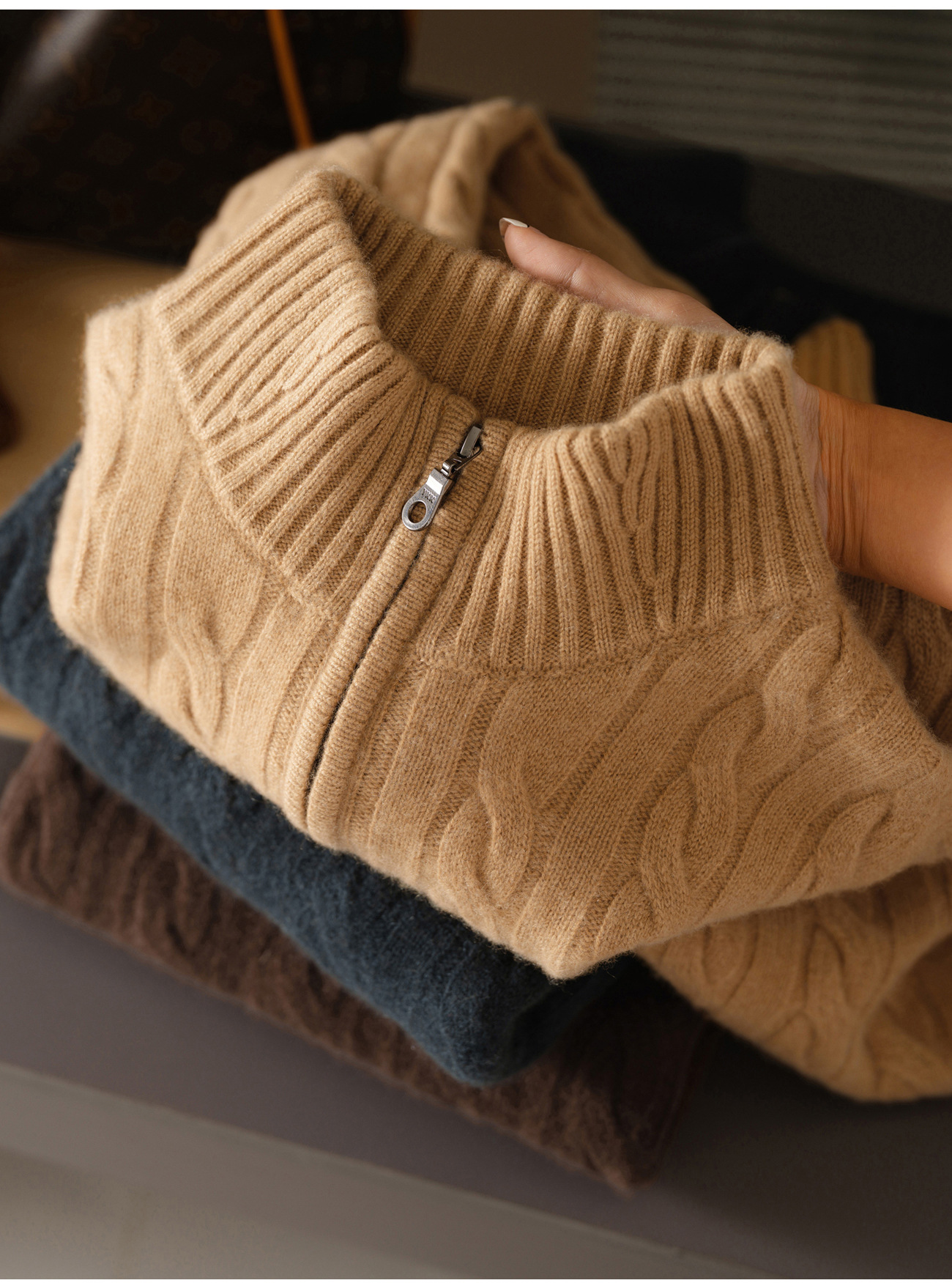 Colors: Sophisticated gray, golden camel, dark coffee