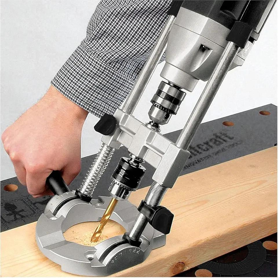 The base has 4 holes and can be secured with screws to ensure stable operation. An additional handle prevents slipping during drilling.