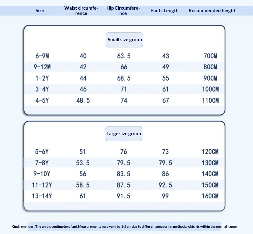 Suitable Height: 6M–5Y (Small Size Set, 5 pieces per set); L Size Set, 5T–14T (5 pieces per set)