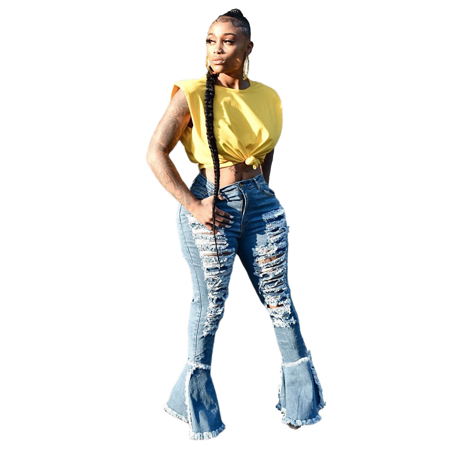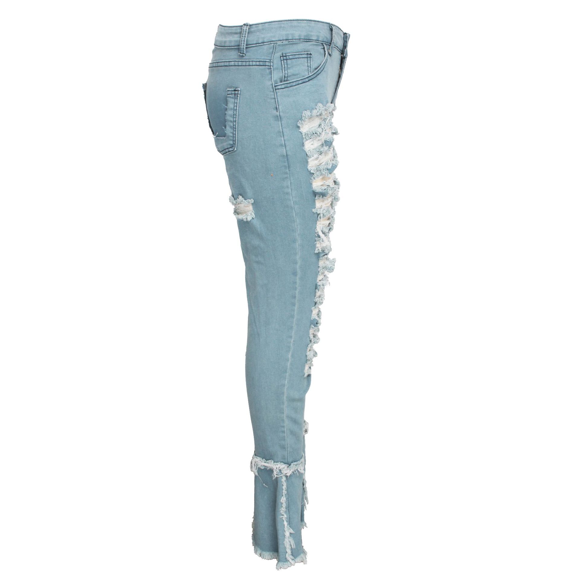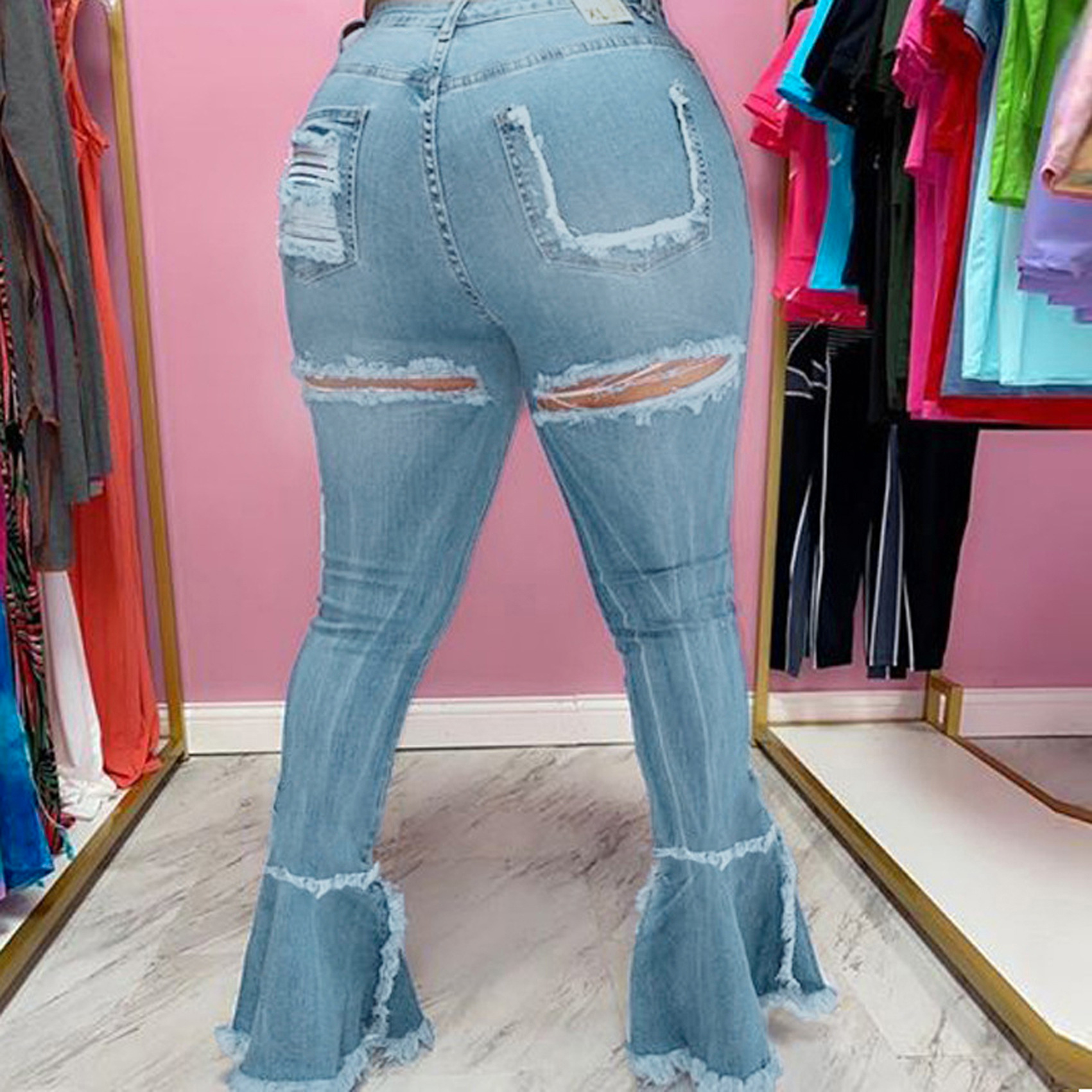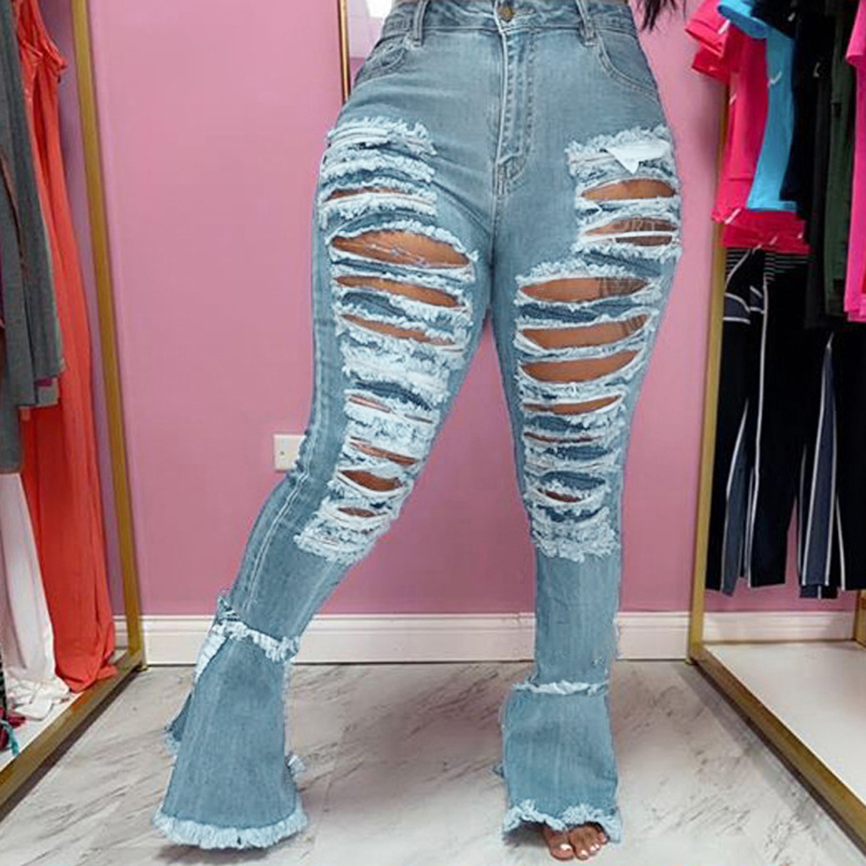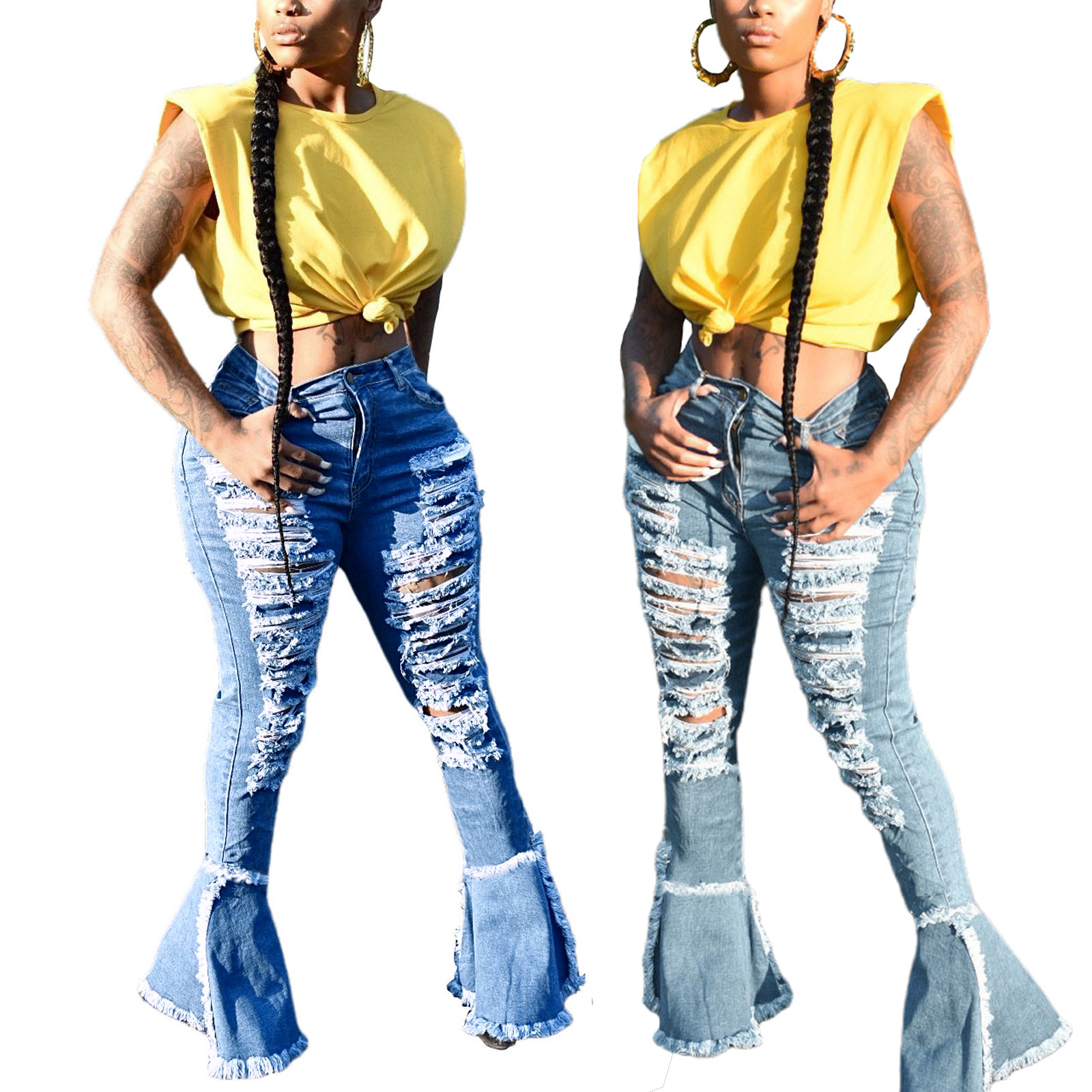 Versatile Washed Ripped Trousers Stitching Micro Flared Pants