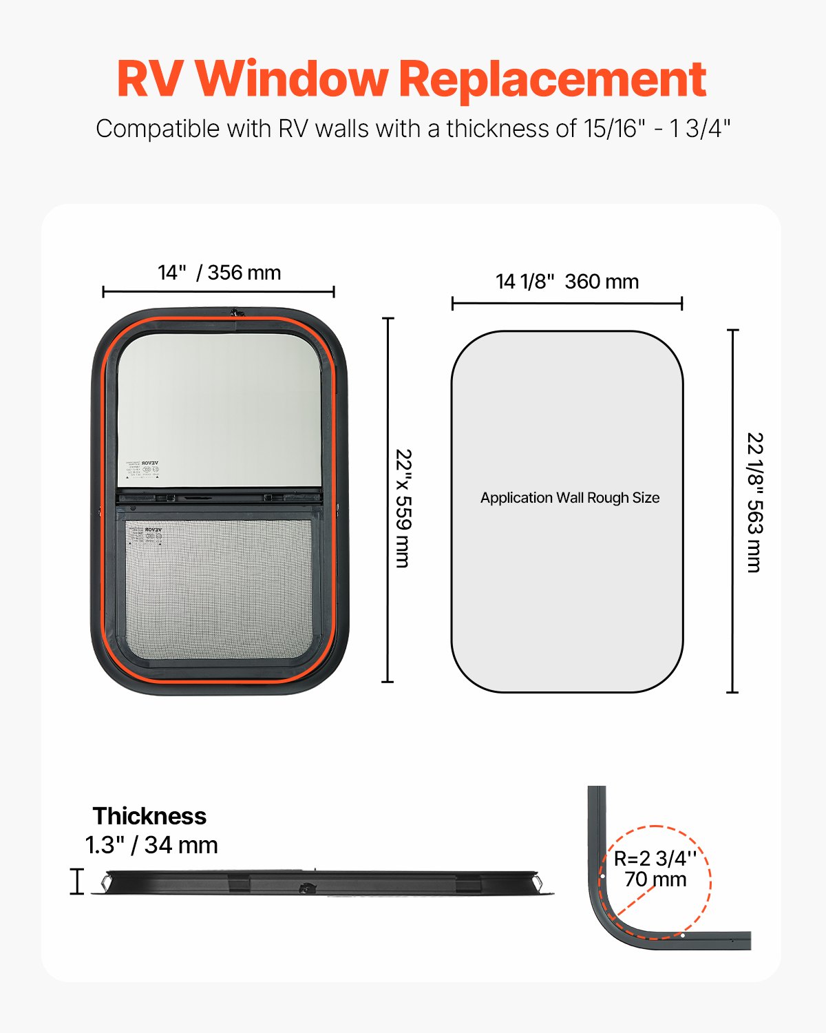Universal Vertical Sliding Window: Our 14"W x 22"H vertical RV window is the ideal replacement for old or damaged windows. Designed to fit 15/16" - 1 3/4" thickness walls, this tinted sliding RV window provides a reliable solution for RVs, trailers, campers, and cargo trailers.