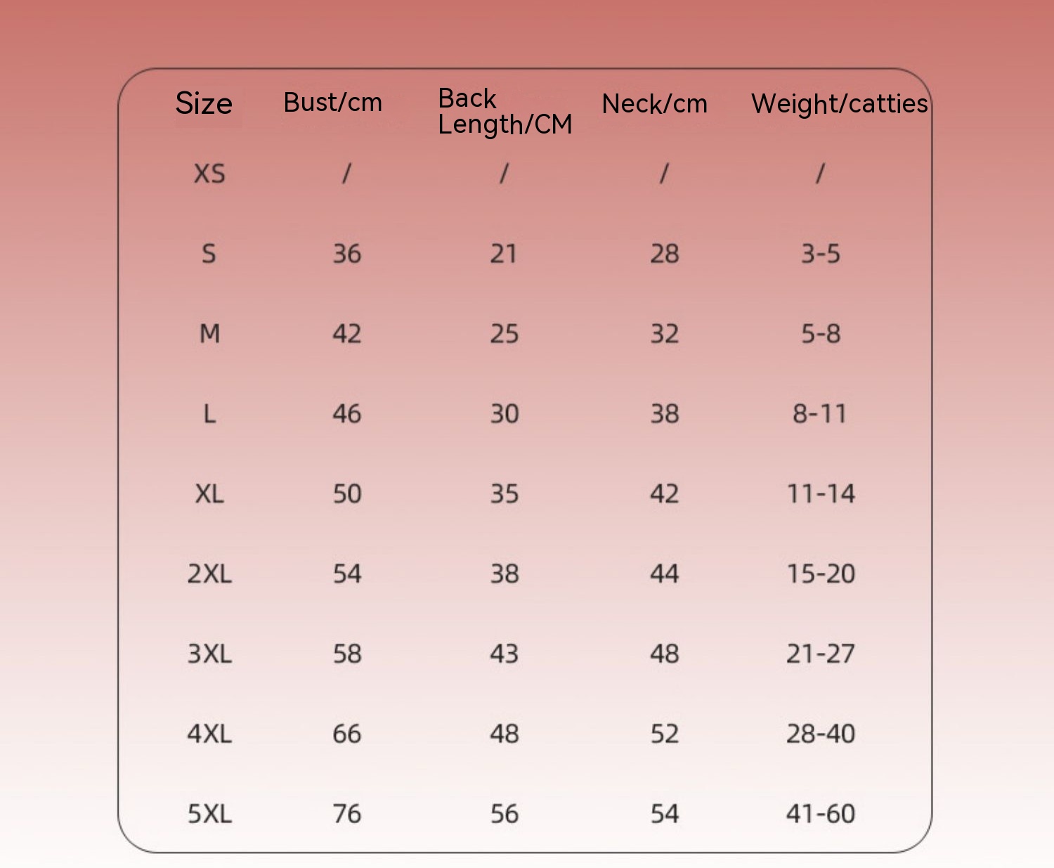 Size: S (weight reference 3-5 jin) M (weight reference 5-8 jin) L (weight reference 8-11 jin) XL (weight reference 11-14 jin) 2XL (weight reference 15-20 jin) 3XL (weight reference 21-27 jin) 4XL (weight reference 28-40 jin) 5XL (weight reference 41-60 jin)