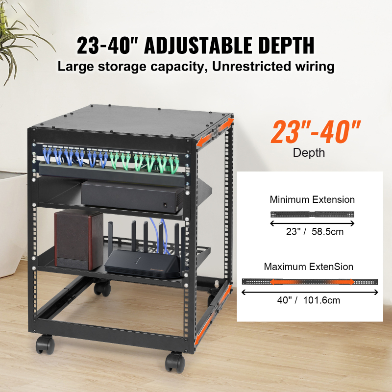 VEVOR 12U Open Frame Server Rack, Adjustable Depth, Free Standing Or Wall Mount Network Server Rack, 4 Post AV Rack With Casters, Holds All Your Networking IT Equipment AV Gear Router Modem