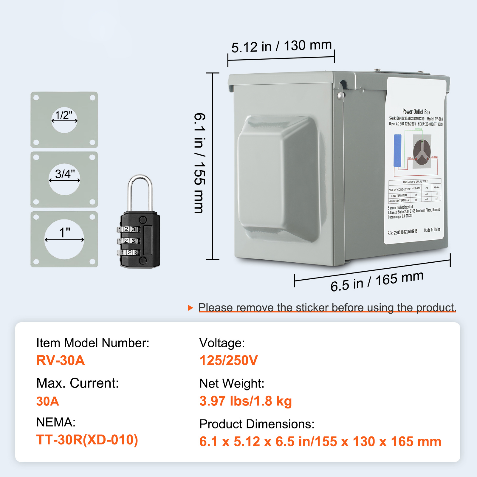 VEVOR 30 Amp RV Power Outlet Box, 125 250 Volt, Enclosed Lockable Outdoor RV Receptacle Box, NEMA TT 30R Weatherproof Electrical Panel, For RV Camper Trailer Motorhome Tested To UL Standards