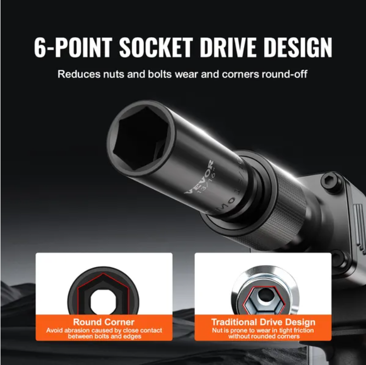 High Torque: Distinguished by its hexagonal drive design, which sets it apart from traditional designs lacking rounded corners, this socket tool set significantly reduces pressure exerted on fasteners during impact. As a result, it minimizes wear and effectively prevents bolt rounding and stripping.