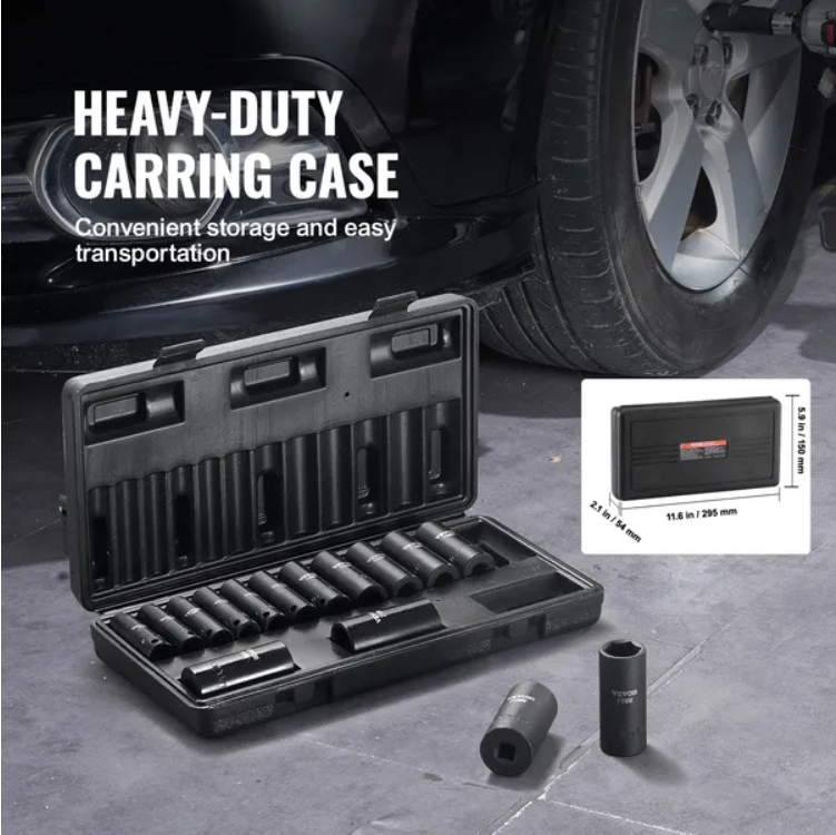 VEVOR Impact Sockets Set 15pcs 6-Point 3 8in Drive Bit Ratchet Tool Kit Case
