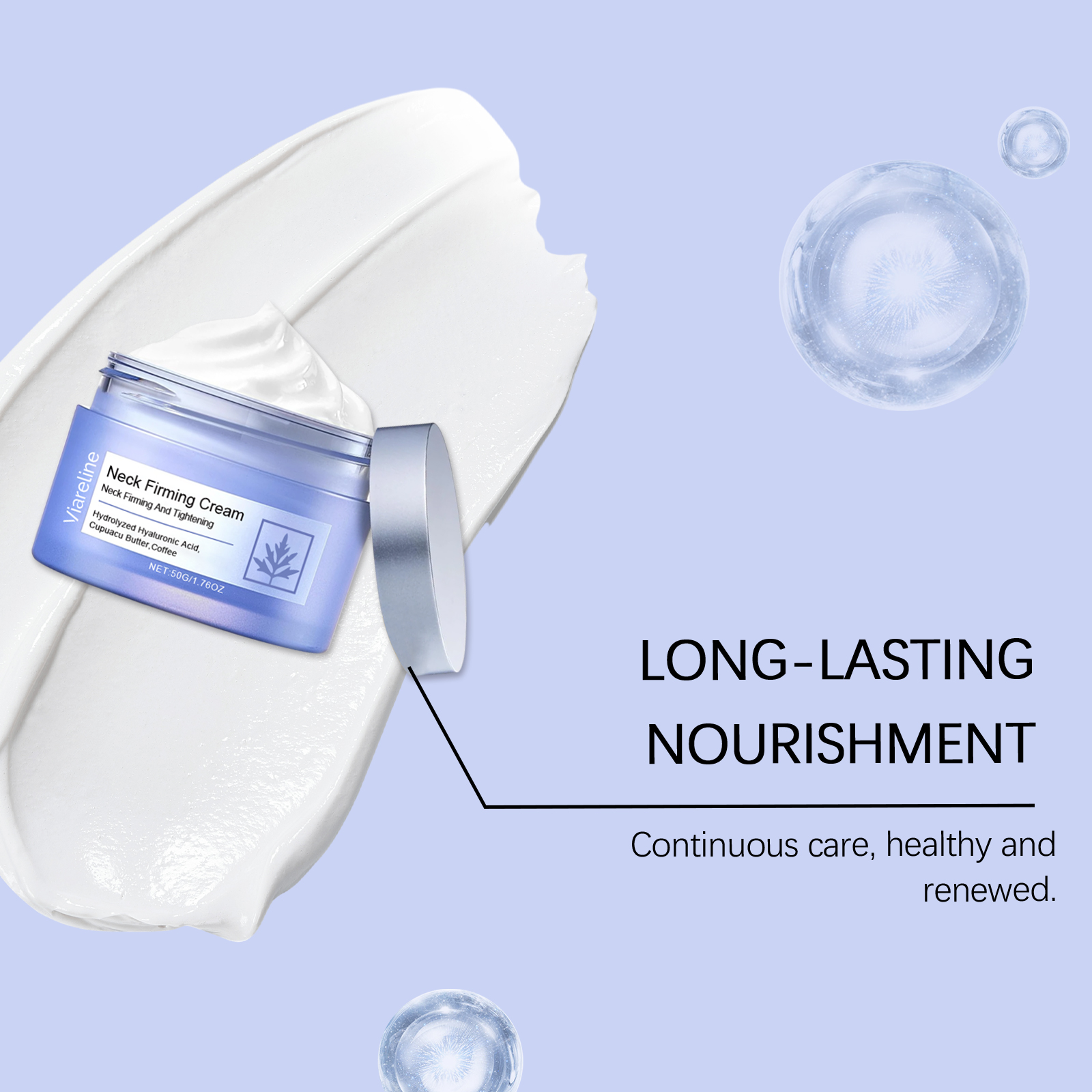 Our neck care cream is carefully formulated with glycerin, mineral oil and glycerin stearate. Designed specifically for deep moisturizing, delicate and smooth, and reshaping the youthful contours of the skin. The usage method is extremely convenient: Apply an appropriate amount to the skin on the neck and gently massage until it is fully absorbed. And it can plump the neck, bid farewell to sagging, firm the skin and make it glow.