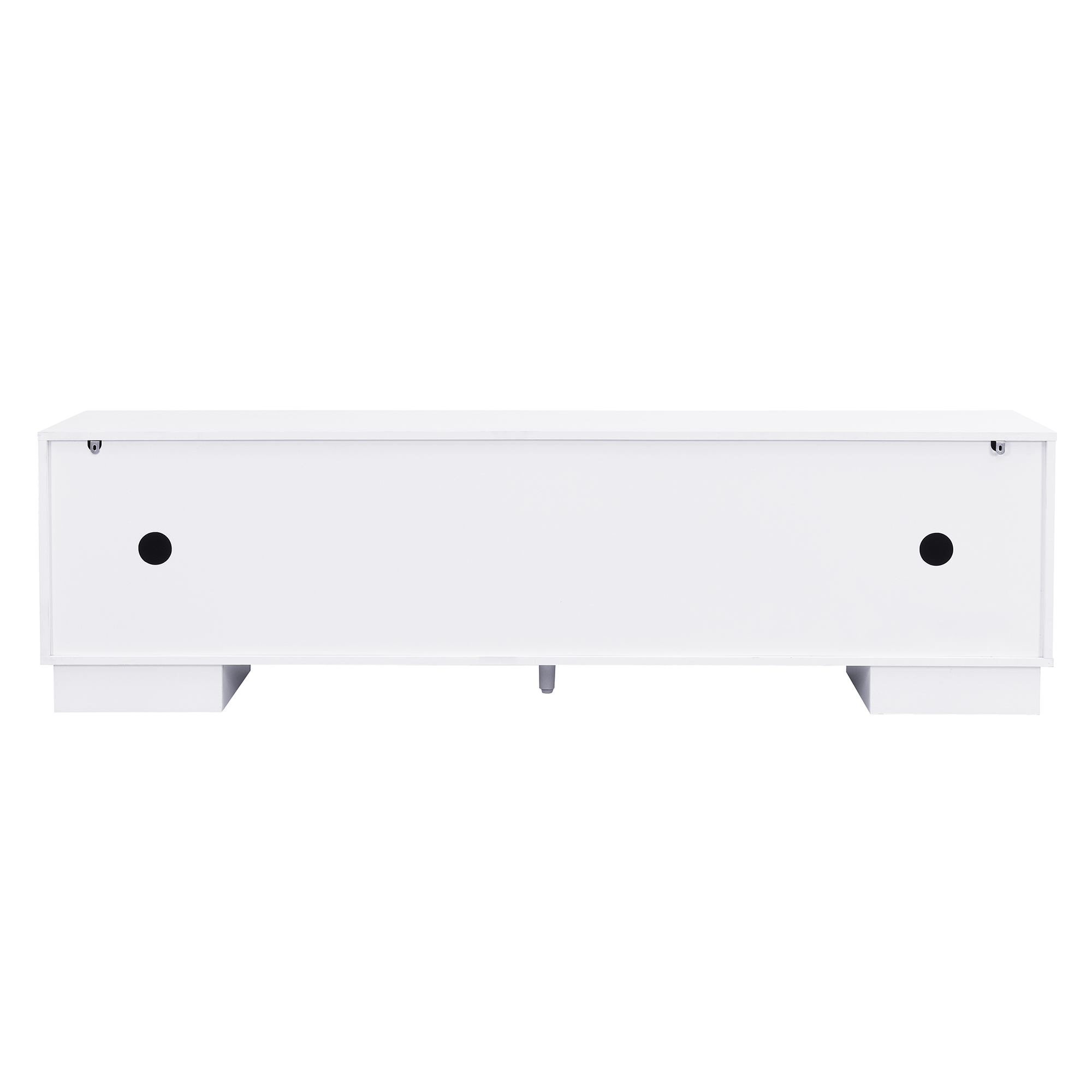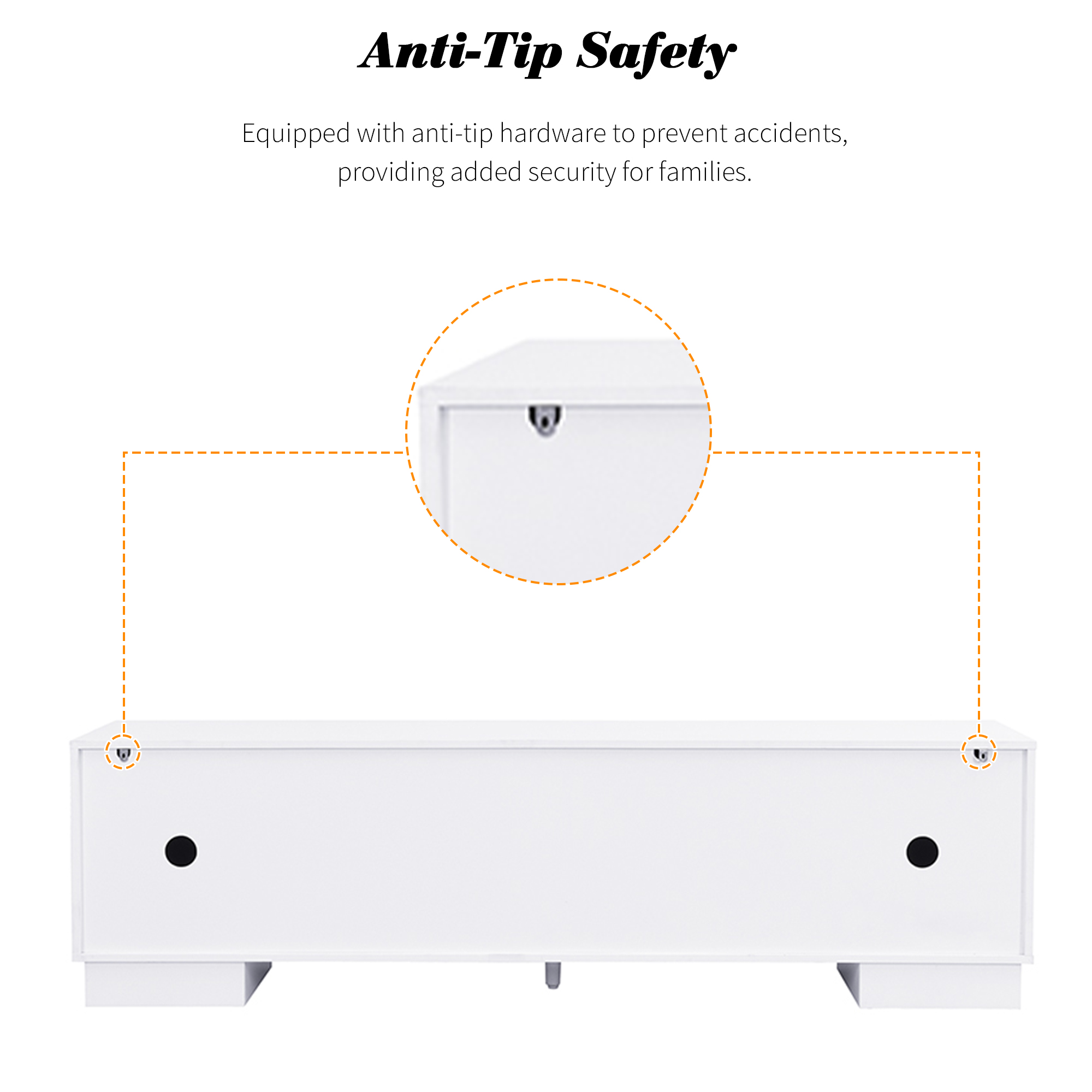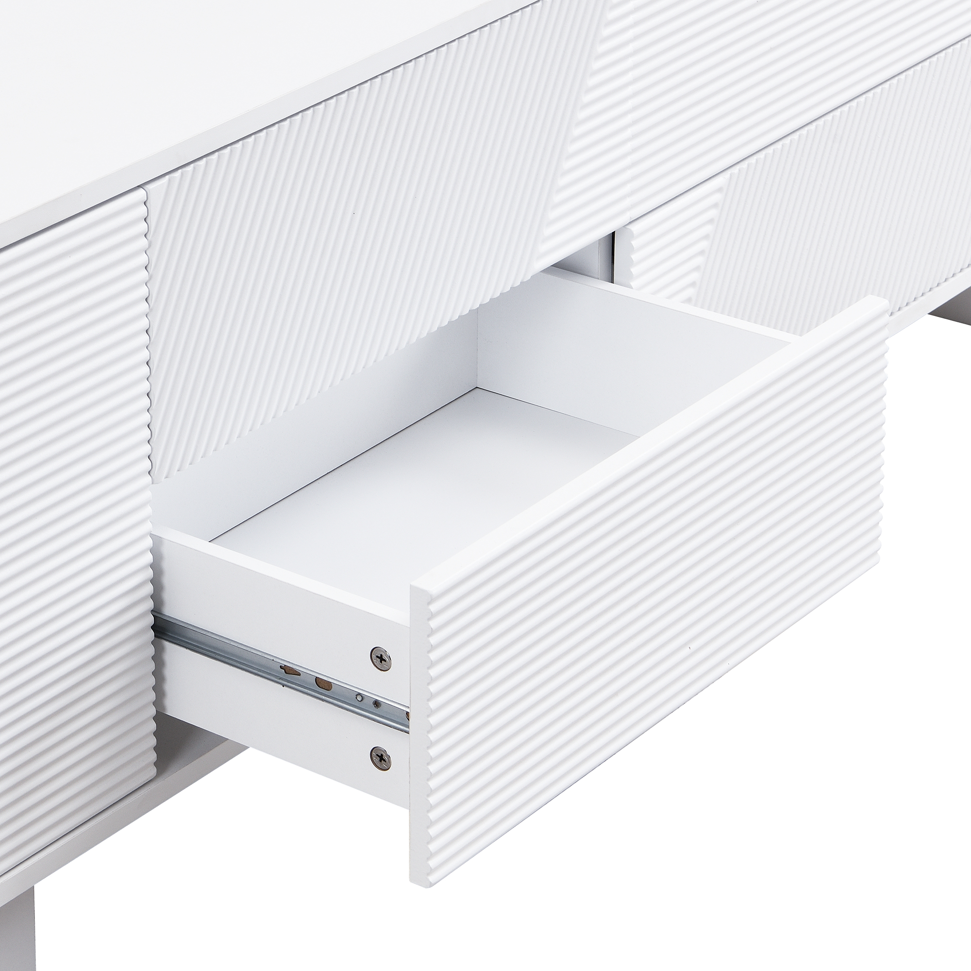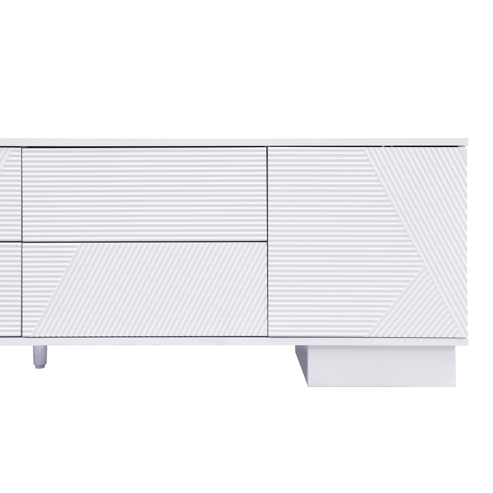 Modern Design: A sleek, minimalist look that complements any home decor. Durable MDF Construction: Long-lasting and sturdy, perfect for large TVs. Efficient Storage: Two spacious compartments and four drawers for easy storage and accessibility. Cable Management: Neatly organize your cables for a clutter-free space. Sturdy Support: Wooden legs and a central metal support leg for enhanced stability. Easy to Clean & Maintain: Smooth, durable surface that resists scratches and stains.