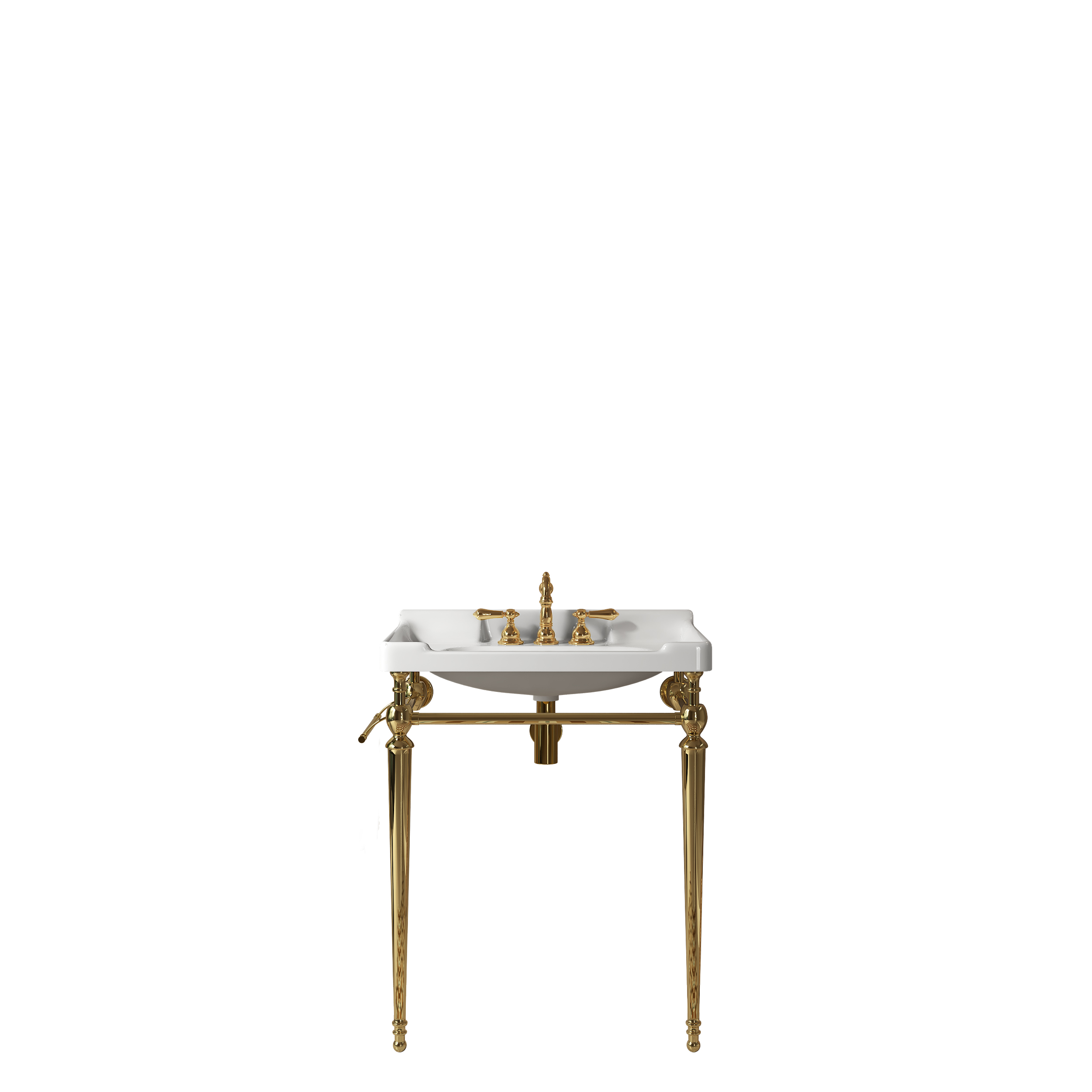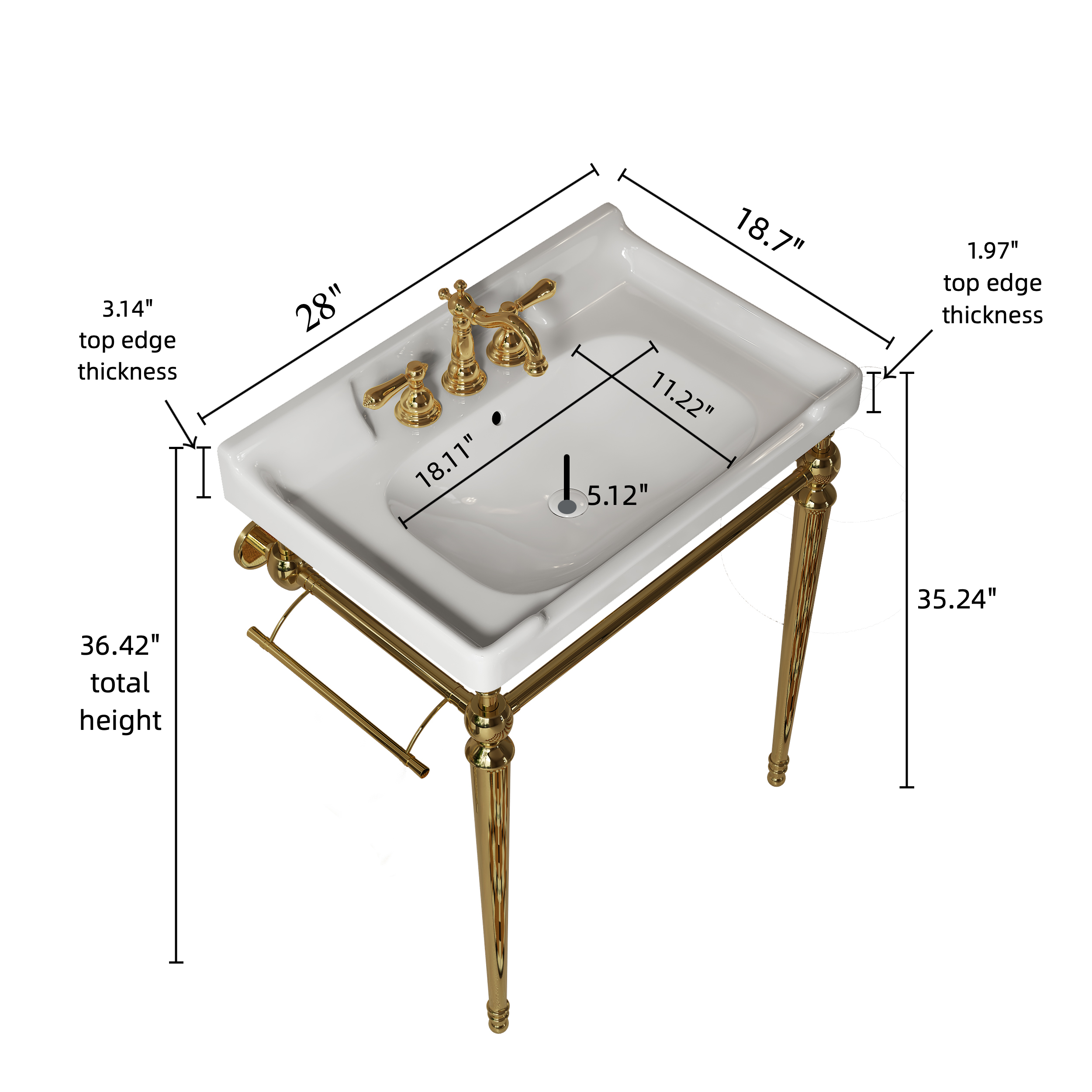 Product Name:VICI 28" Bathroom Console Sink, Wall-Mounted White Ceramic Vanity Basin with 3 Pre-drilled Faucet Holes, Freestanding Stainless Steel Support Legs with Towel Bar, No Faucet & Sink Cover, Gold Color