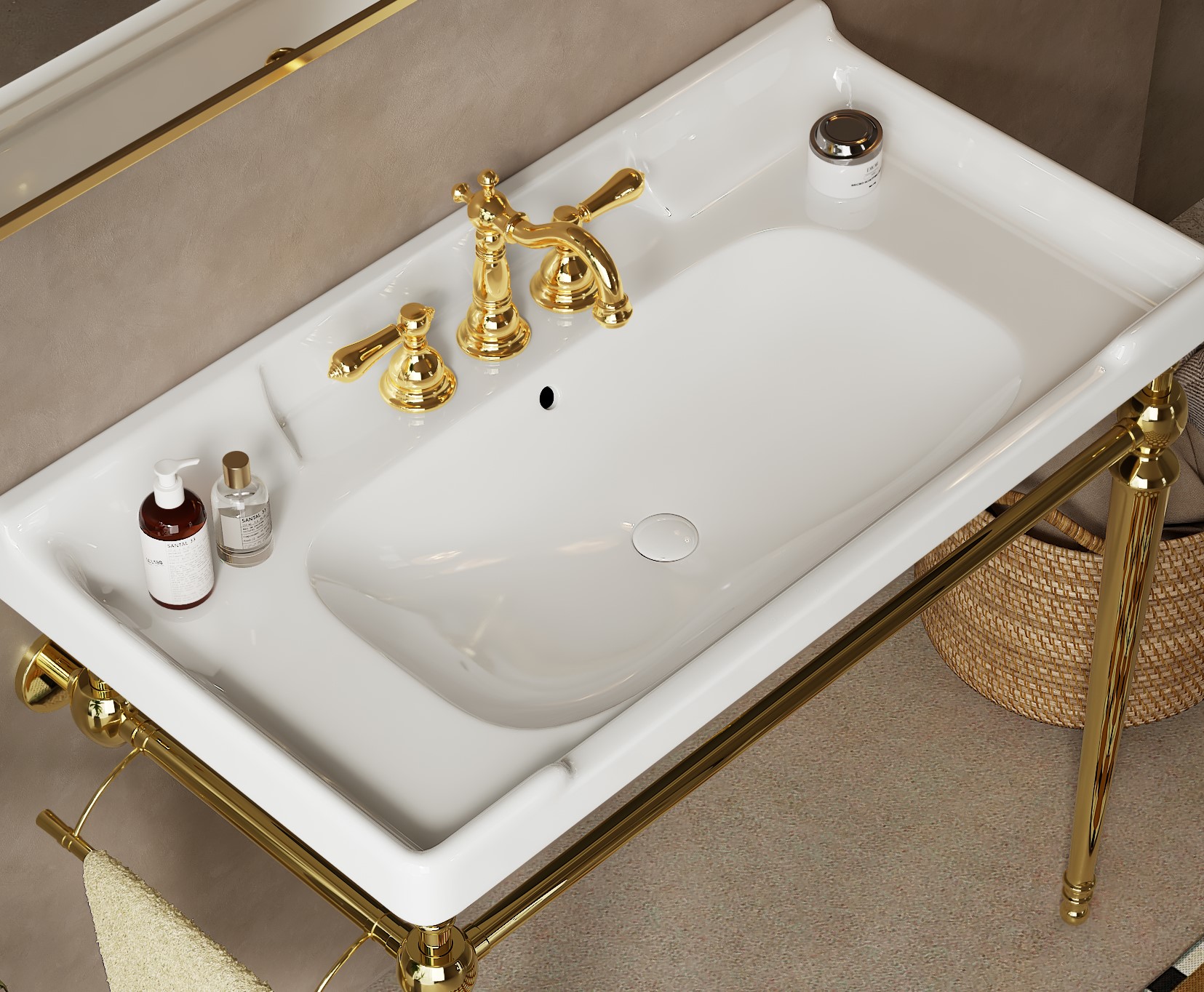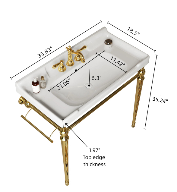 Product Name:VICI 36" Bathroom Console Sink, Wall-Mounted White Ceramic Vanity Basin with 3 Pre-drilled Faucet Holes, Freestanding Stainless Steel Support Legs with Towel Bar, No Faucet & Sink Cover, Gold Color