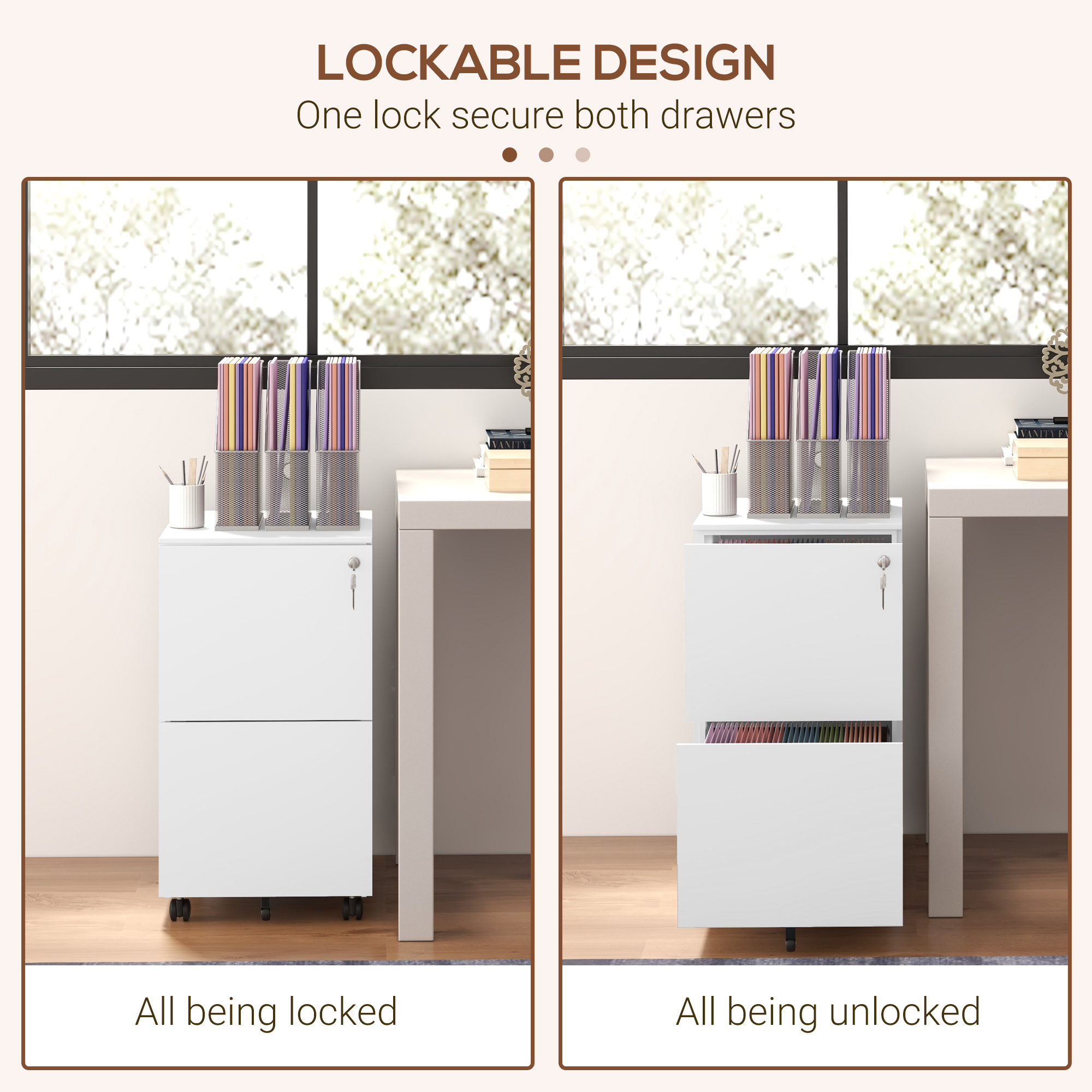 Easy and protected storage for the office - this Vinsetto filing cabinet. Made from steel, this is a strong and durable piece - it's made to be used everyday and is a safe shield for the inner contents. It comes with two drawers, so you can keep files stored and organised. The top lock keeps the two drawers locked at the same time, so you don't have to worry about unwanted people accessing inside when you're not around - two keys included.