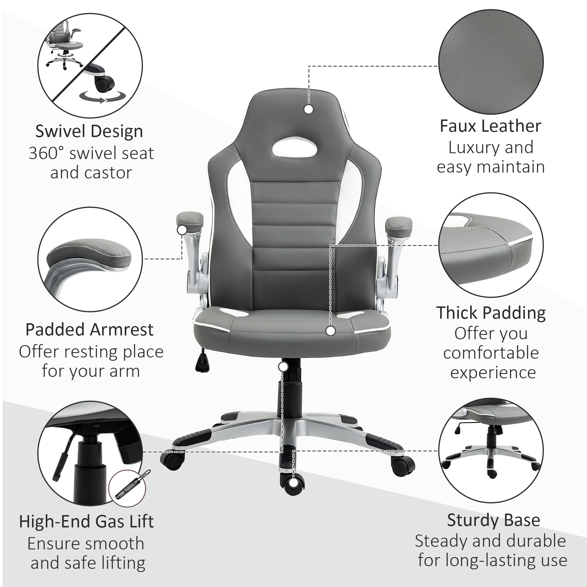 Gaming times galore lie ahead: this stylish office chair. Faux leather upholstery in a bright blue, white and black colour block design is striking and cool. Padded all over to keep you comfortable. A tall back for support; the armrests flip up to offer you extra support when needed. The seat swivels freely side to side, moving with your body's motion so you don't strain yourself. Complete with five wheels on the base.