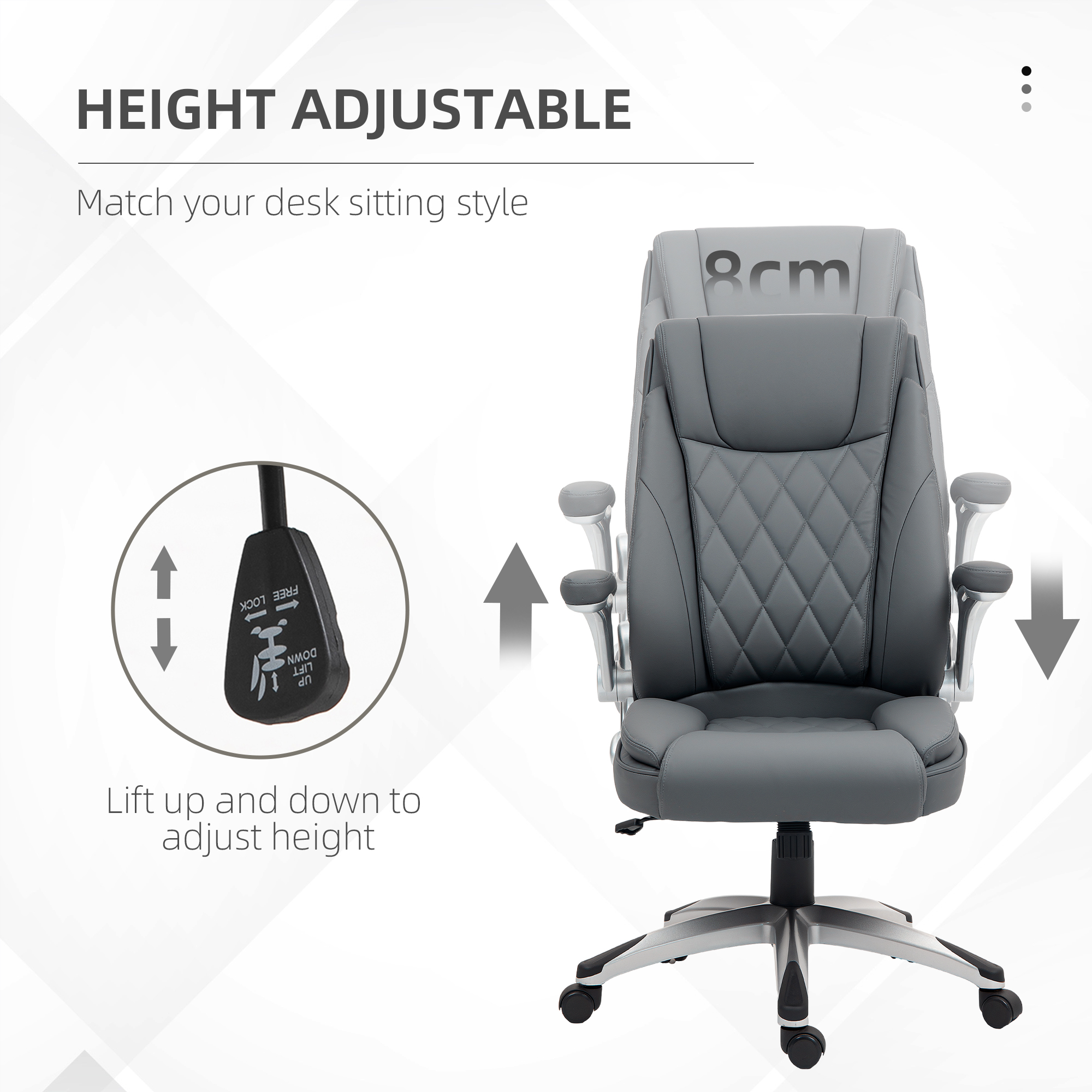 Take charge of comfort in your home office with the Vinsetto desk chair. Thick padding keeps you comfortable all day, while the high back, headrest and armrests provide full support. Adjustable height and a 360° swivel base with five caster wheels let you move easily across your workspace. Wrapped in easy-care faux leather, this chair is a seat you'll love sinking into as you get things done.