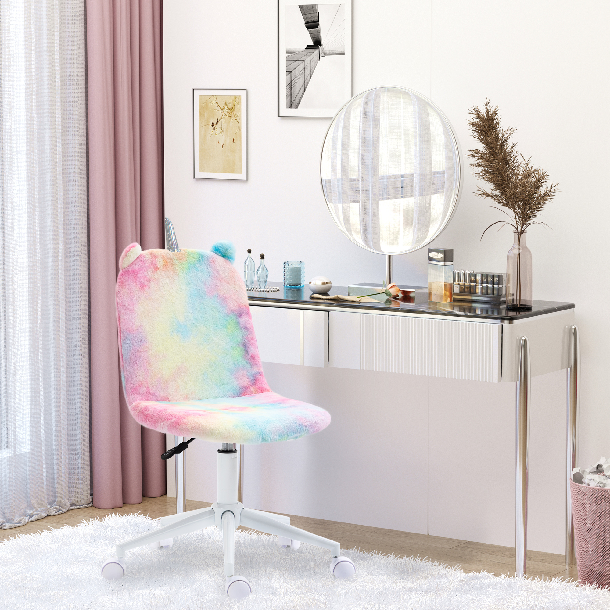 Magical work times? You got it with this chair from Vinsetto. A standard armless design, it's wrapped in unicorn-coloured upholstery, with ears and a silver-tone horn to match - great way to bring fun into your home and office times. Filled with sponge for comfort, wrapped in fluffy upholstery for a soft plush feel. Swivel seat which moves with your body's motions, it's complete with five wheels for easy movement.