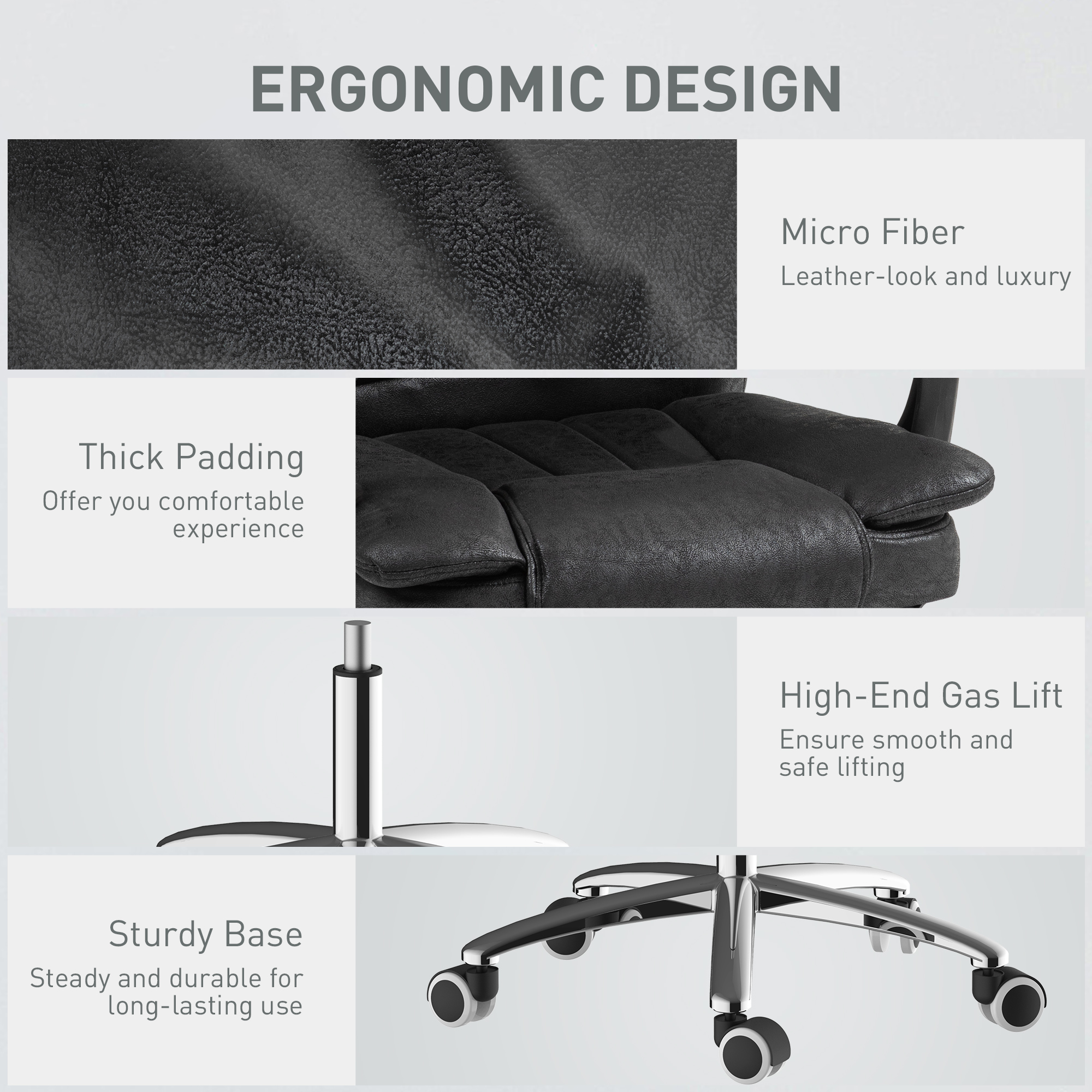 A piece to make your working days comfortable and not so draining: this high back office chair from Vinsetto. The luxurious design consists of thick padded, soft microfibre upholstery, a reclining back, and a manual footrest. The seat height of the computer chair is adjustable for a working level best for you. Finished with five wheels to move around easily.