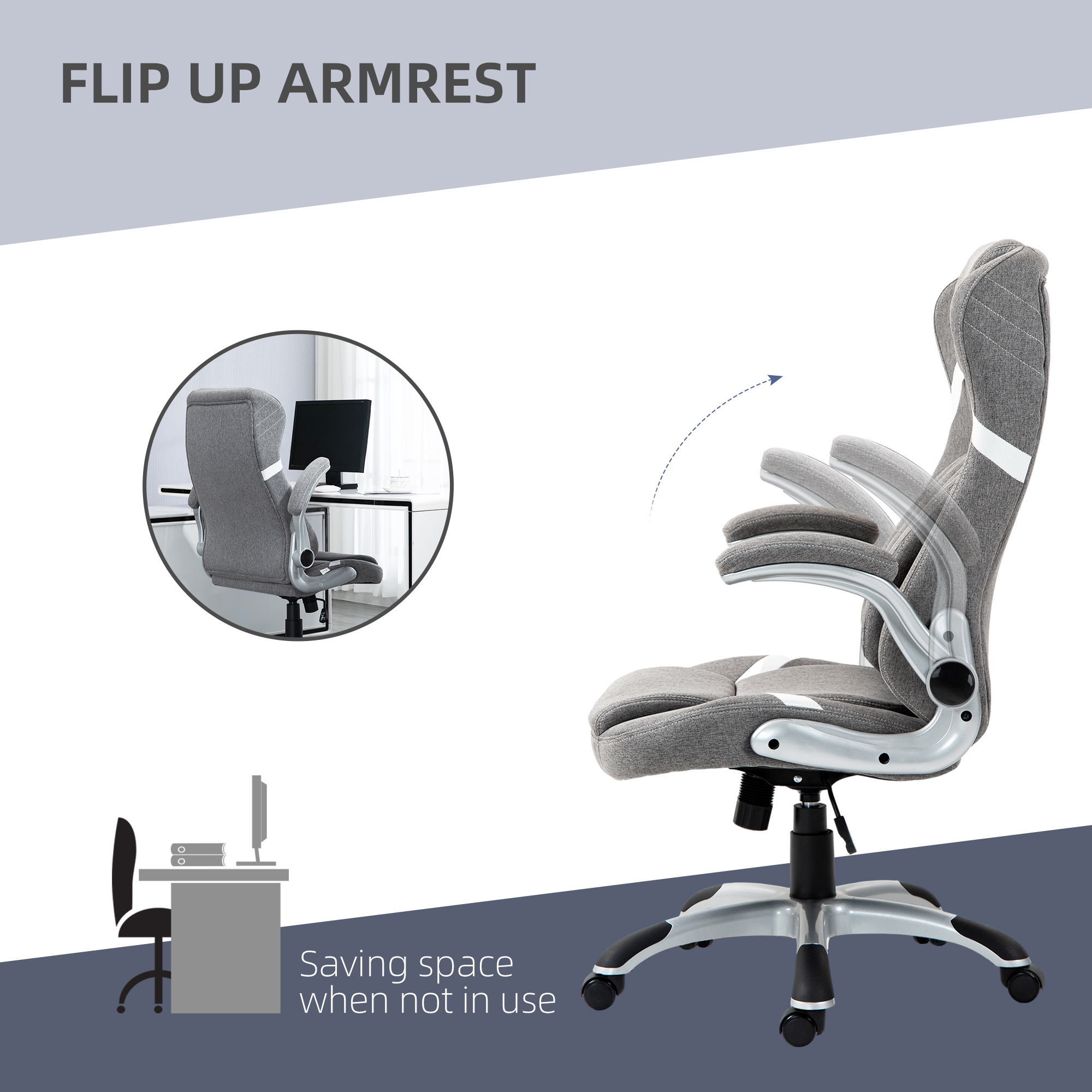 A simple, comfortable chair to make your work days as easy as possible. This Vinsetto piece comes filled with soft sponge, and is wrapped in linen-look upholstery for a softly smooth piece. Adjust the height between 44-52cm and find a level you like best. It comes with an adjustable tension knob - set the back to an angle which supports you best. Complete with five wheels, this swivel chair is easy to roll around on the floor, at all times.