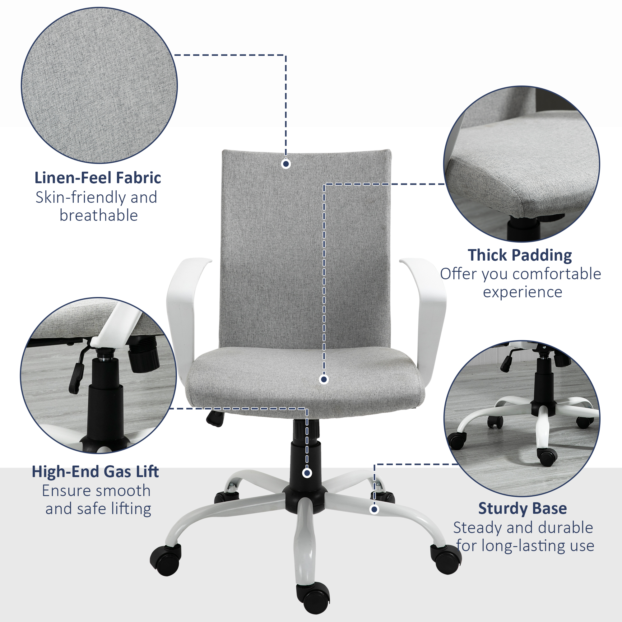 Working whenever will always be comfortable with this Vinsetto office chair. Adjust the seat height with the easy-control lever underneath the comfy chair - between 89cm and 99cm: work at a level best for you. Features a padded seat for comfort, with a high back and fixed armrests to support your body. The 360° swivel seat moves with your body as you move, so you don't strain yourself. Sit down in comfort and work all day long - no hassle at all.