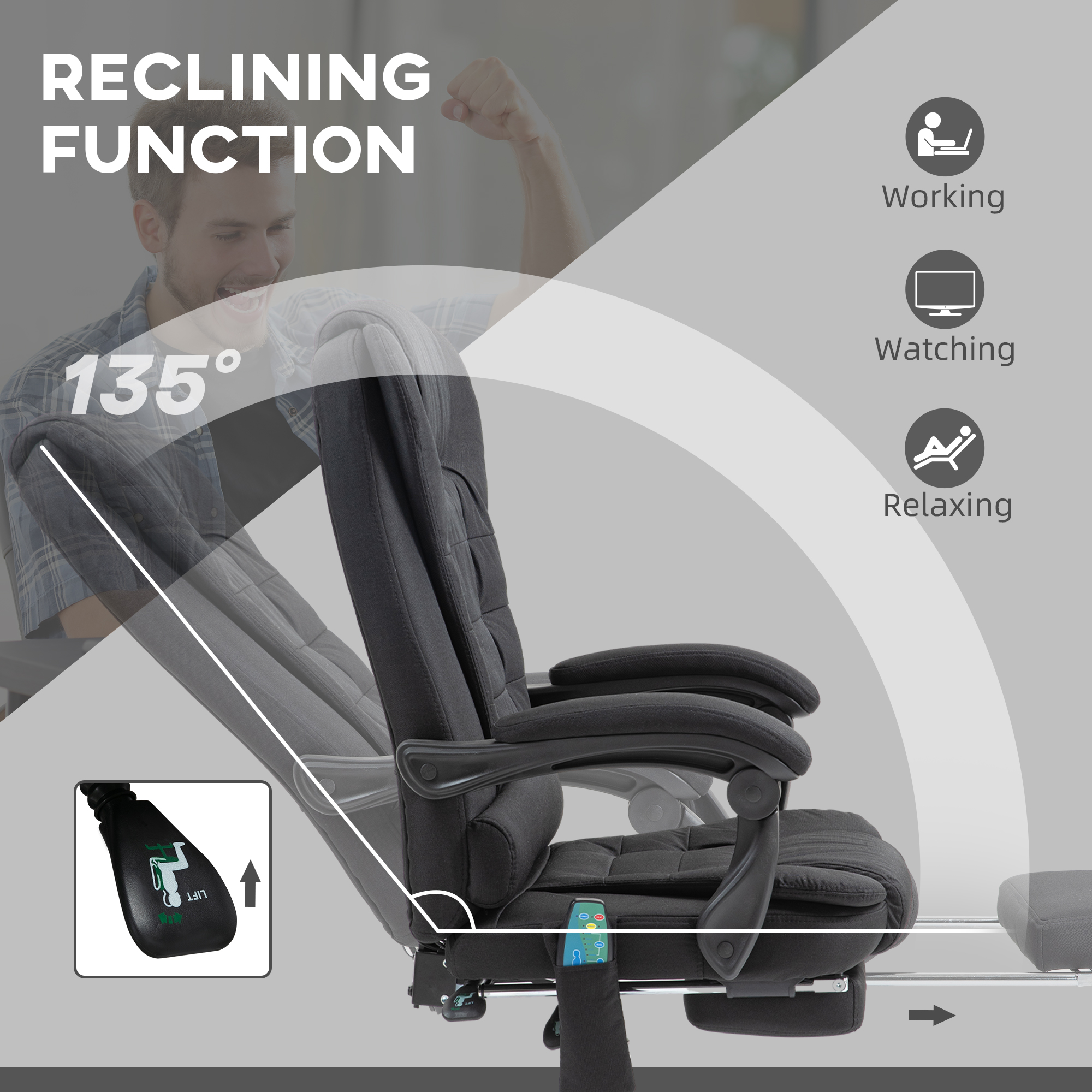 Work and relax, with this Vinsetto massage office chair. Wrapped in soft and stylish linen-feel fabric upholstery, this computer chair is great to sit on and look at! But, most importantly, it has six heated massage points - four on the back, two on the seat: simply turn on the remote and relax. The seat gives wide sitting room, a high back and arms for support. With a 135° reclining backrest, finished with a manual footrest to elevate your lower body with ease.