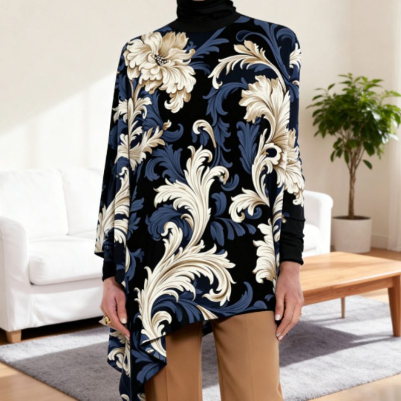 Vintage Baroque Pattern Turtleneck Asymmetric Hem Long-Sleeve Top