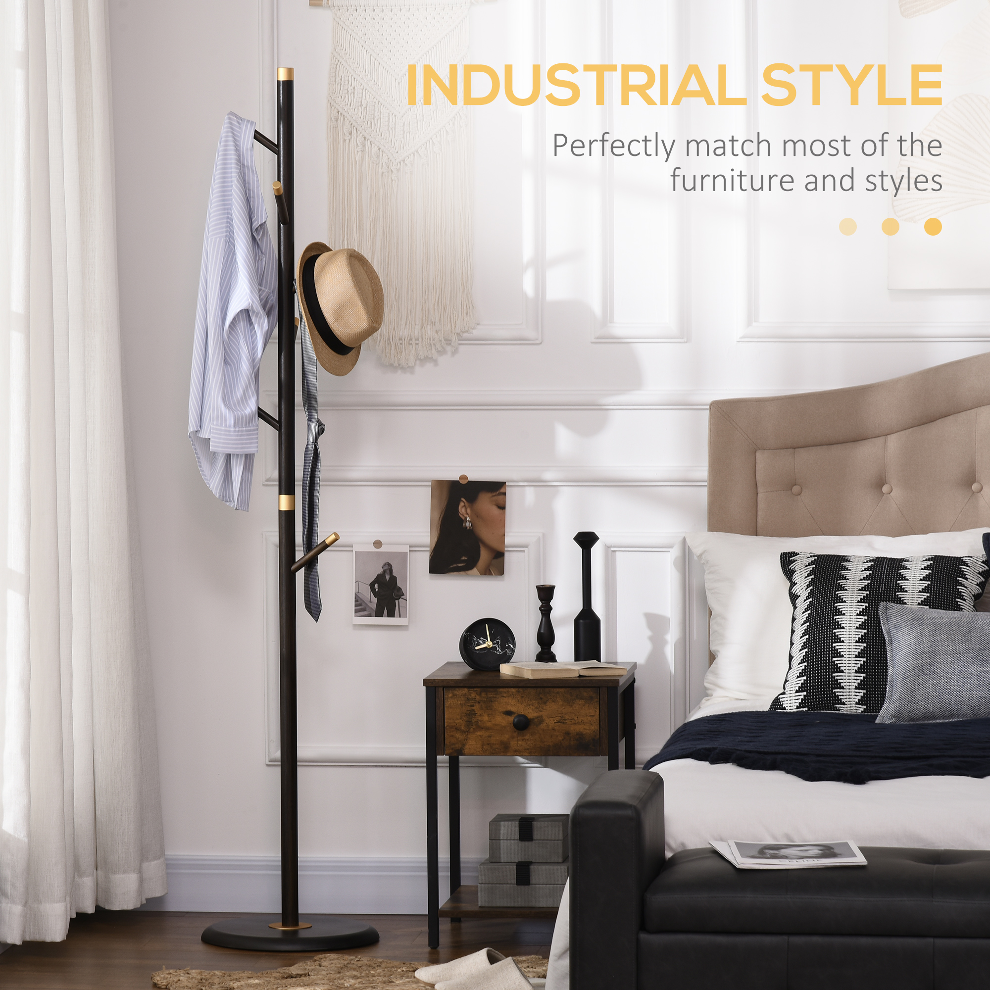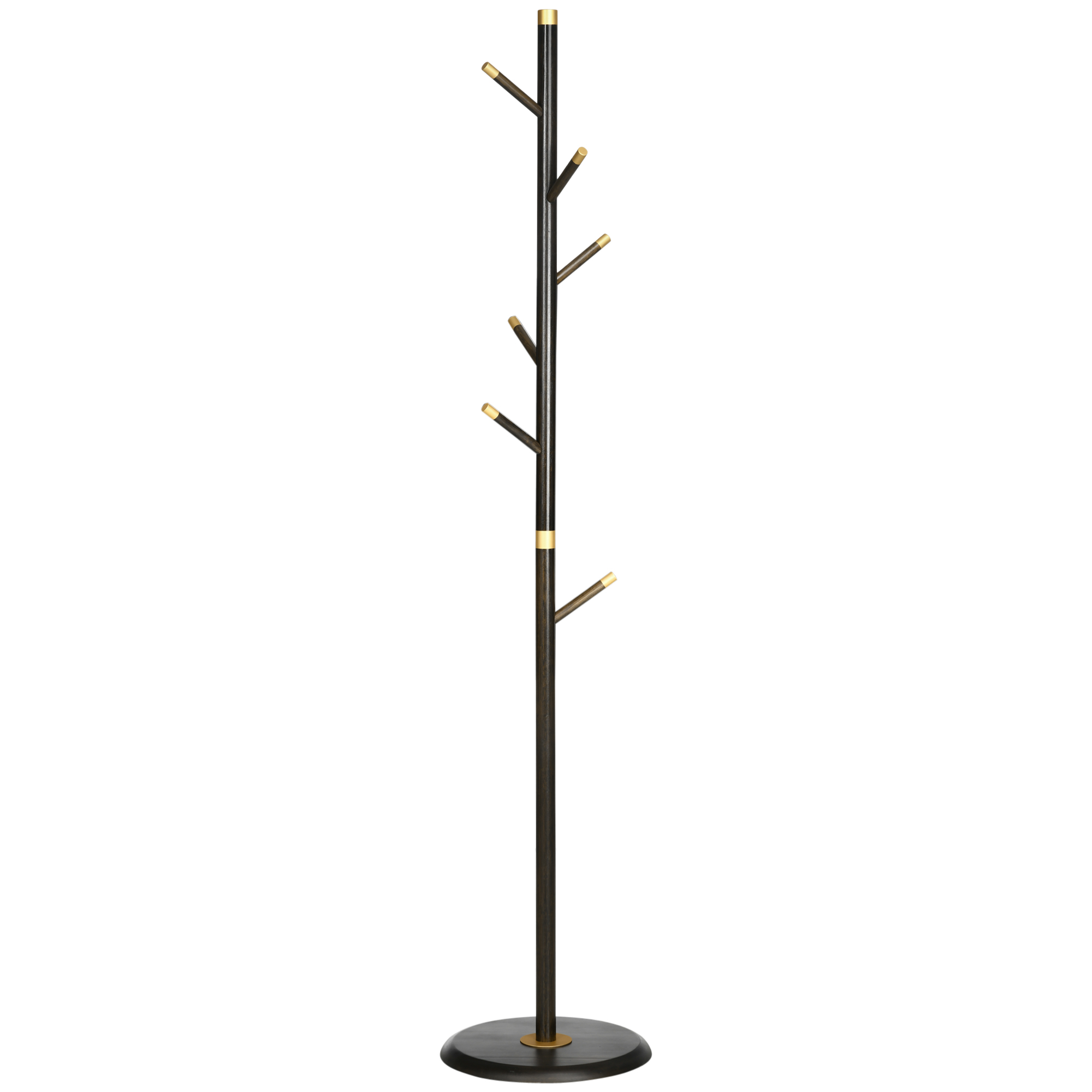A coat stand for the hallway and beyond - this number. A bamboo frame for a strong structure, with a round base for balance; formed into a six hook design - plenty of room for keeping coats, outwear and accessories together and in a convenient place. The polished finish with gold coloured tips creates a sleek and stylish look. Use in your hallway, lounge, office or bedroom.