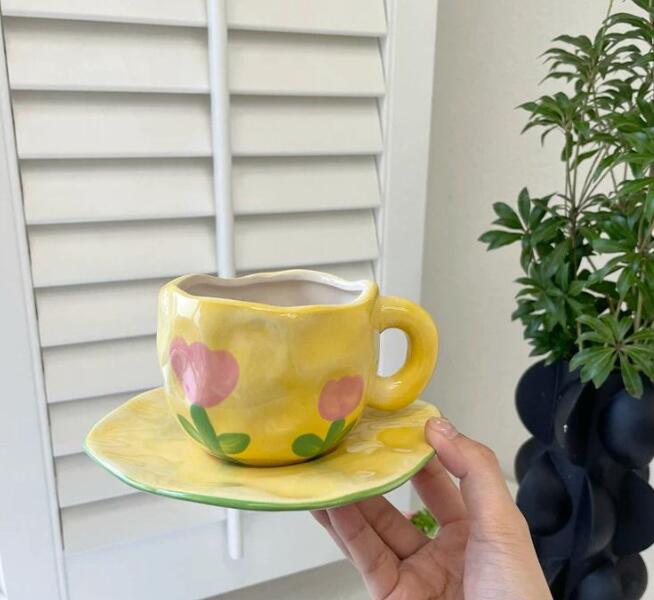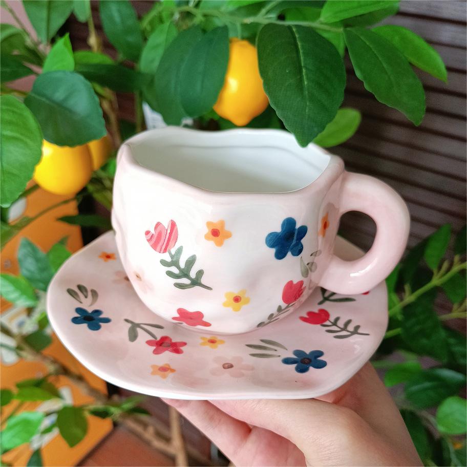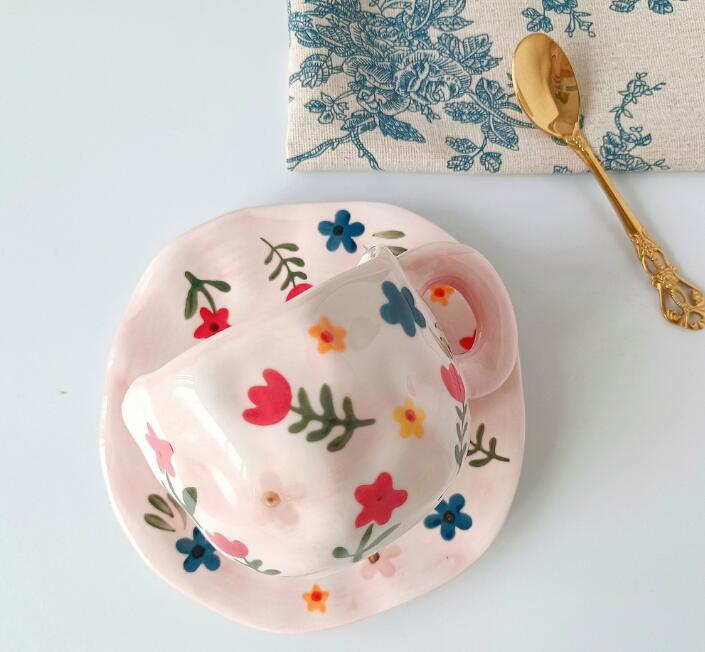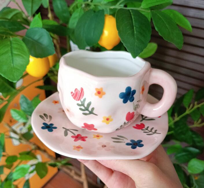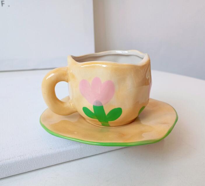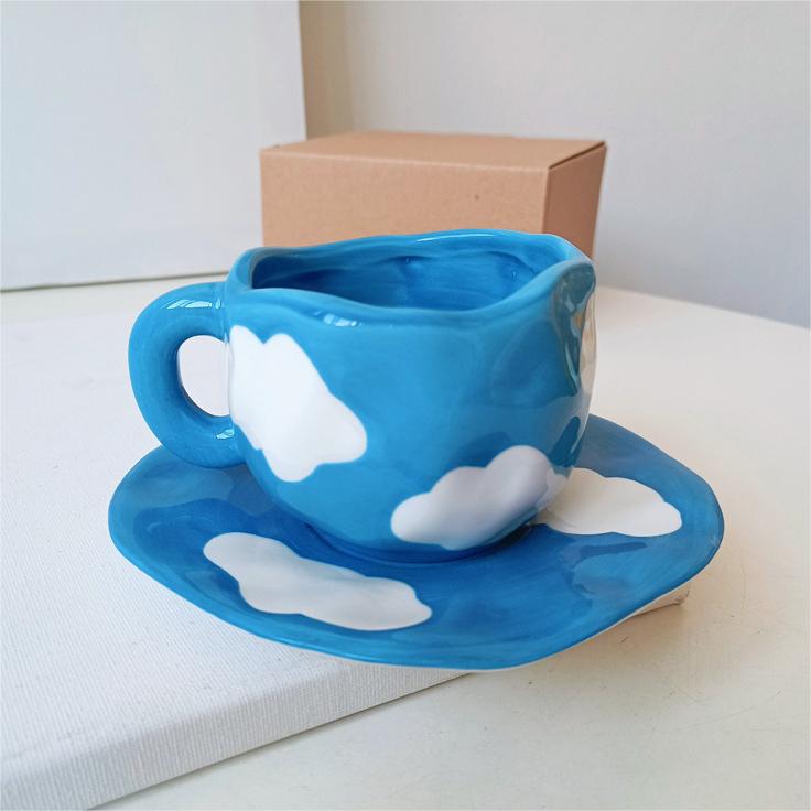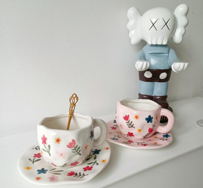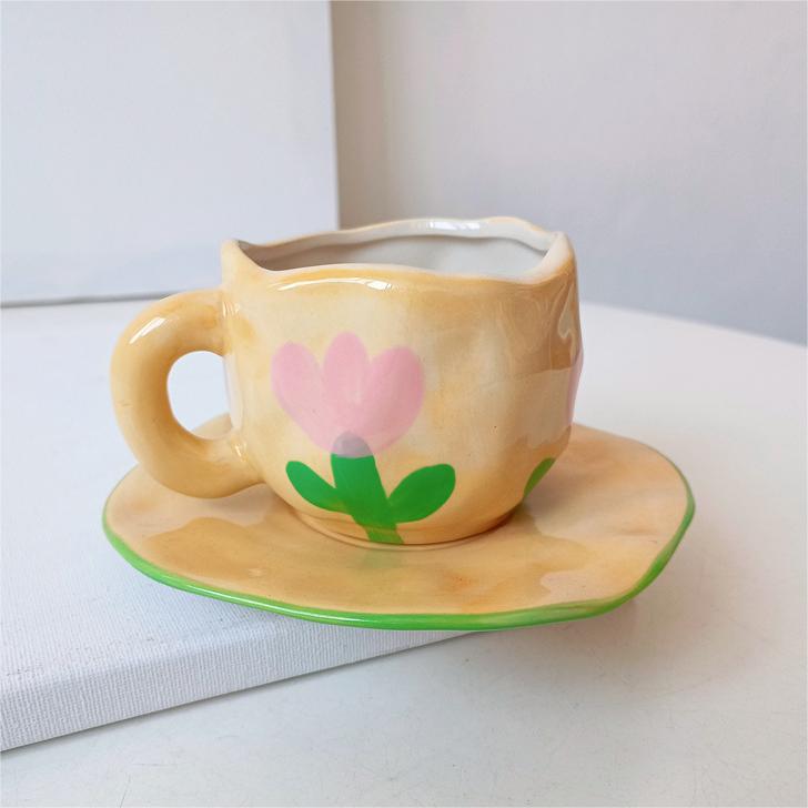 Color: white background floral cup and saucer suit, pink background floral cup and saucer suit, blue sky and white clouds, hand painted pink plaid, yellow background tulip, pink flower hand pinch Cup suit