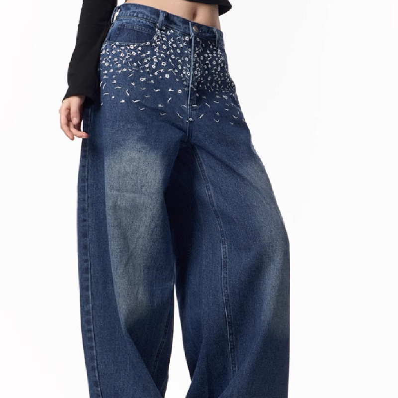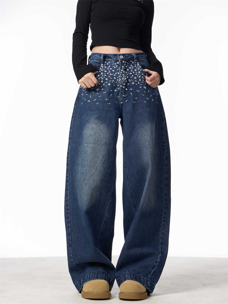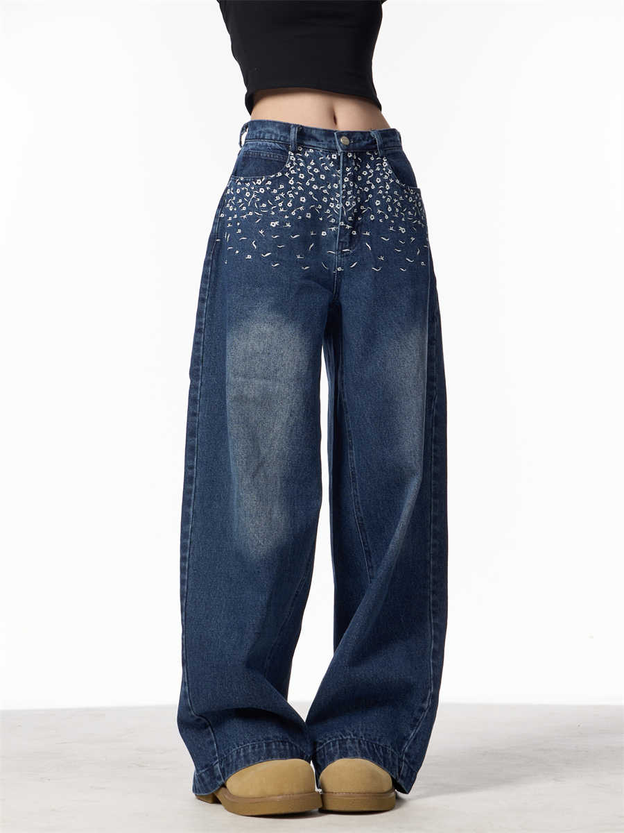 Vintage Floral Embroidered Straight Jeans Women Loose Casual Wide-leg Trousers