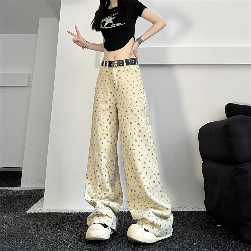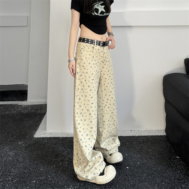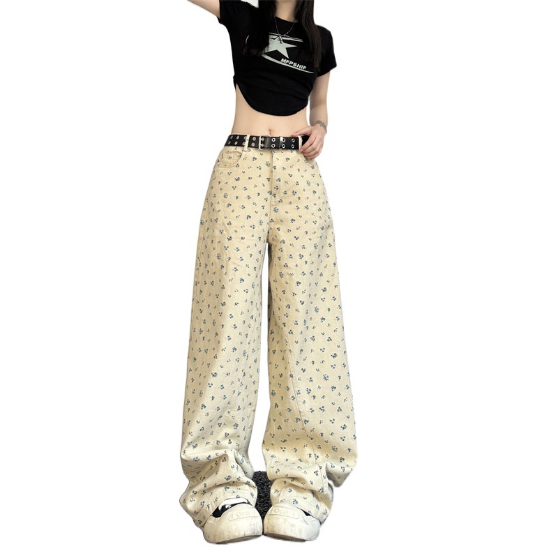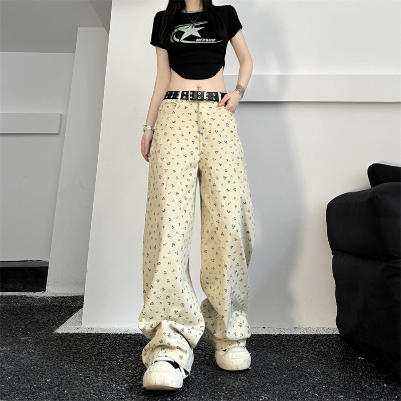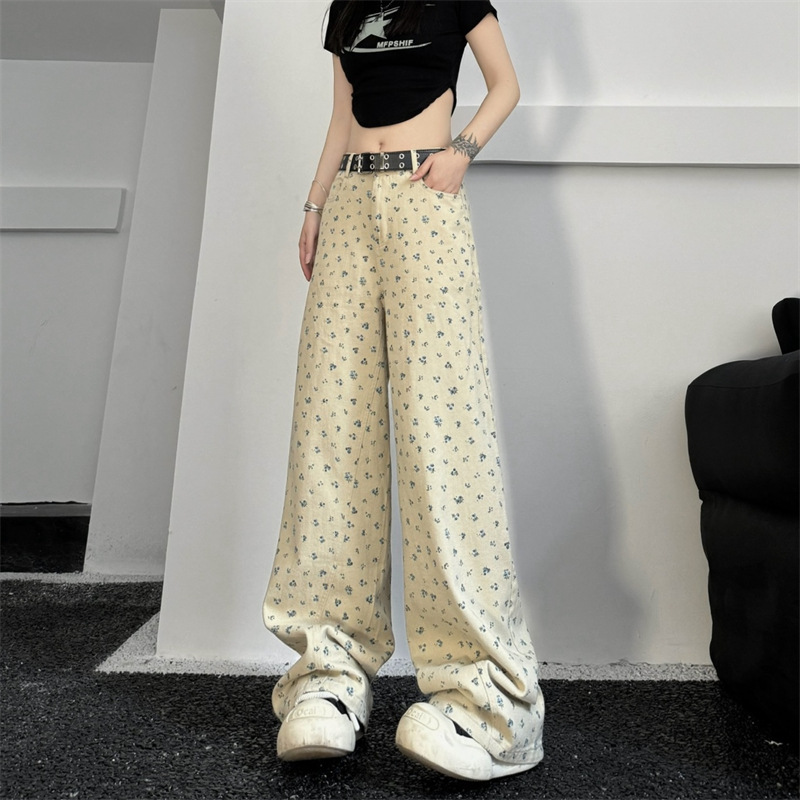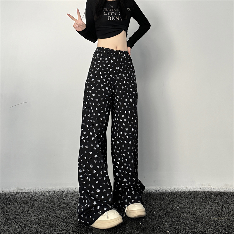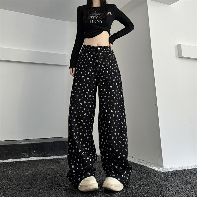 Vintage Floral High Waist Loose And Slimming Wide Leg Straight Jeans