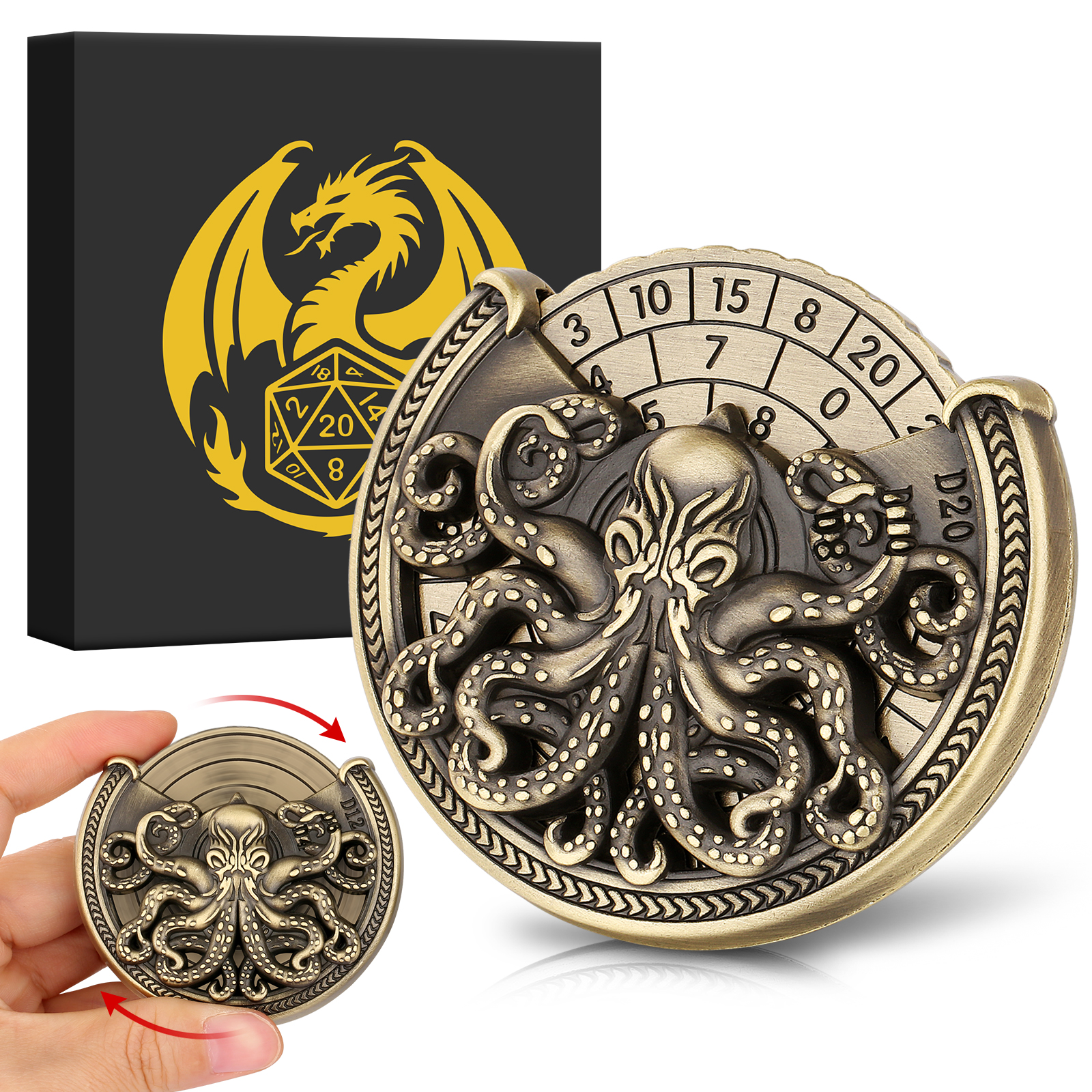 Vintage Kesulu Style, Super Refined Metal Octopus Dice Turntable Gift Box, Immersive Board Game Experience, D20 Random Surprise, Necessary Props For D&D Team