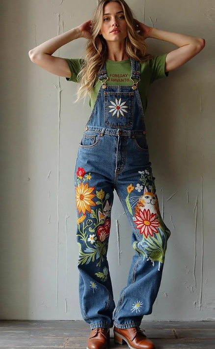 Vintage Kitty And Floral Oil Painting Art Jeans Jumpsuit