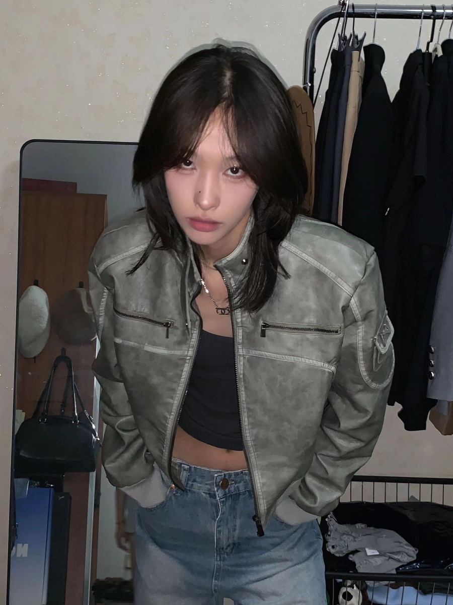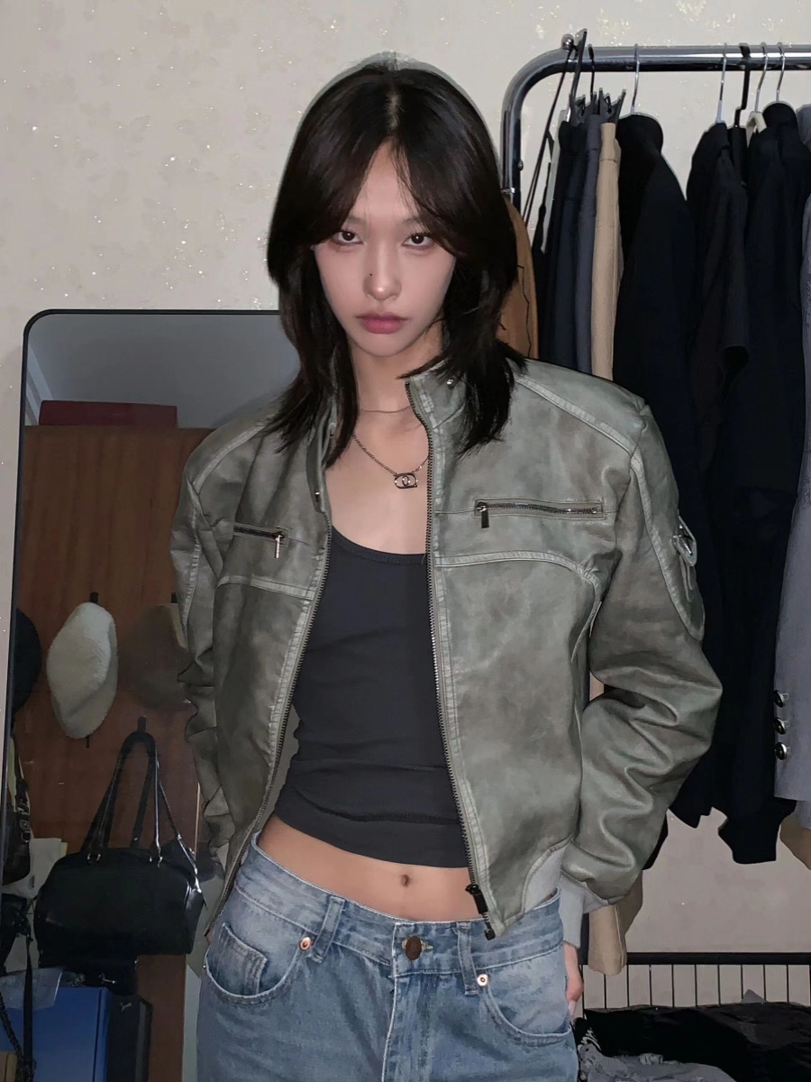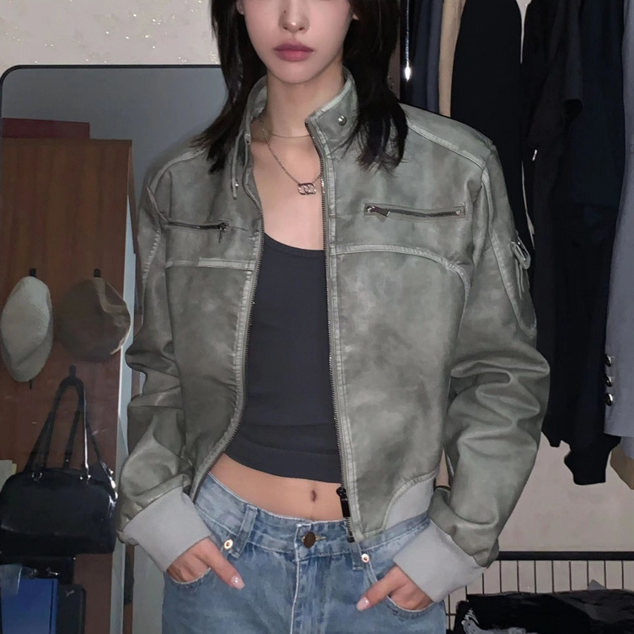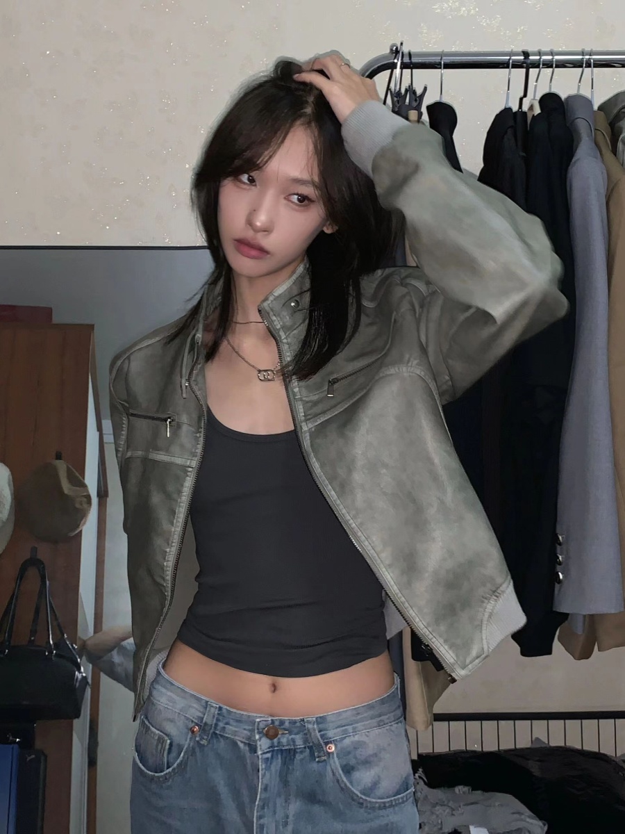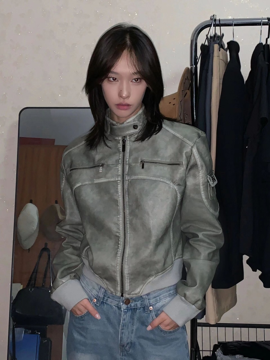 Vintage Ladies Do Old Short Leather Coat Coat Stand Collar
