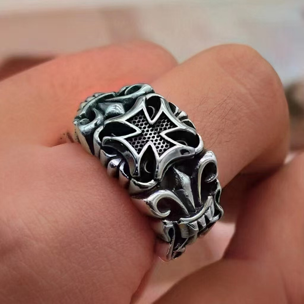 Vintage Maltese Cross Biker Ring, Two-Tone Gothic Adjustable Statement Band, Punk Rock Heavy Ring For Men
