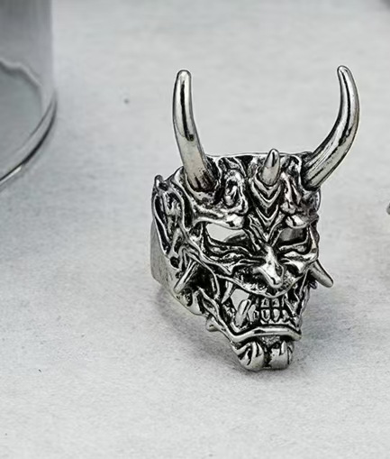 Vintage Silver Oni Hannya Mask Ring, Gold Horns Demon Skull Adjustable Band, Gothic Punk Biker Ring For Men