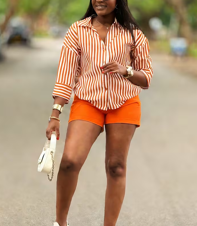Vintage Striped Loose-fit Shirt Style: American Vintage / Commuting Casual / Oversized Flattering Collar Collar Type: Lapel (with Open V-neck) Cut: Loose-fit with Dropped Shoulders, Relaxed and Casual Seasonality: Spring, Summer, Fall (Can be worn throughout the year, with the highest compatibility in spring and autumn)