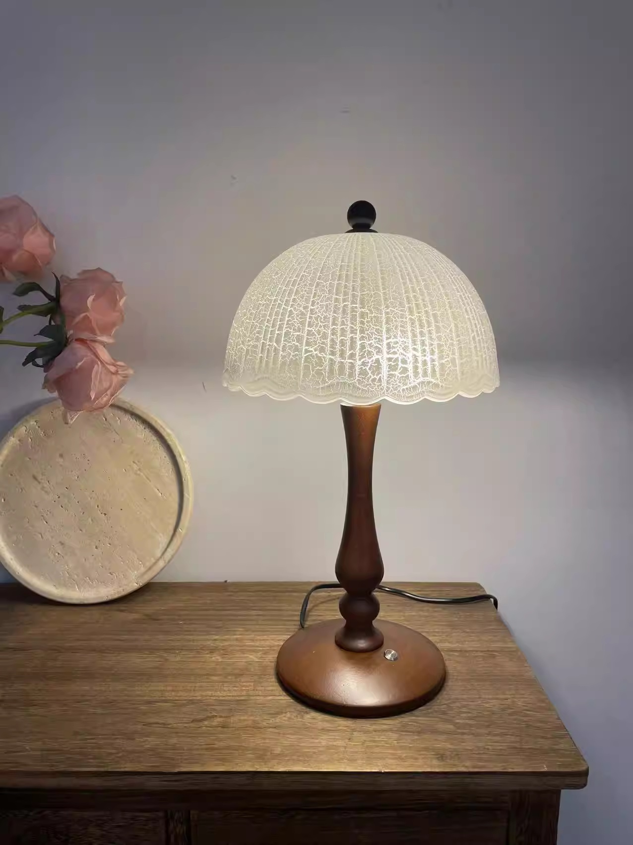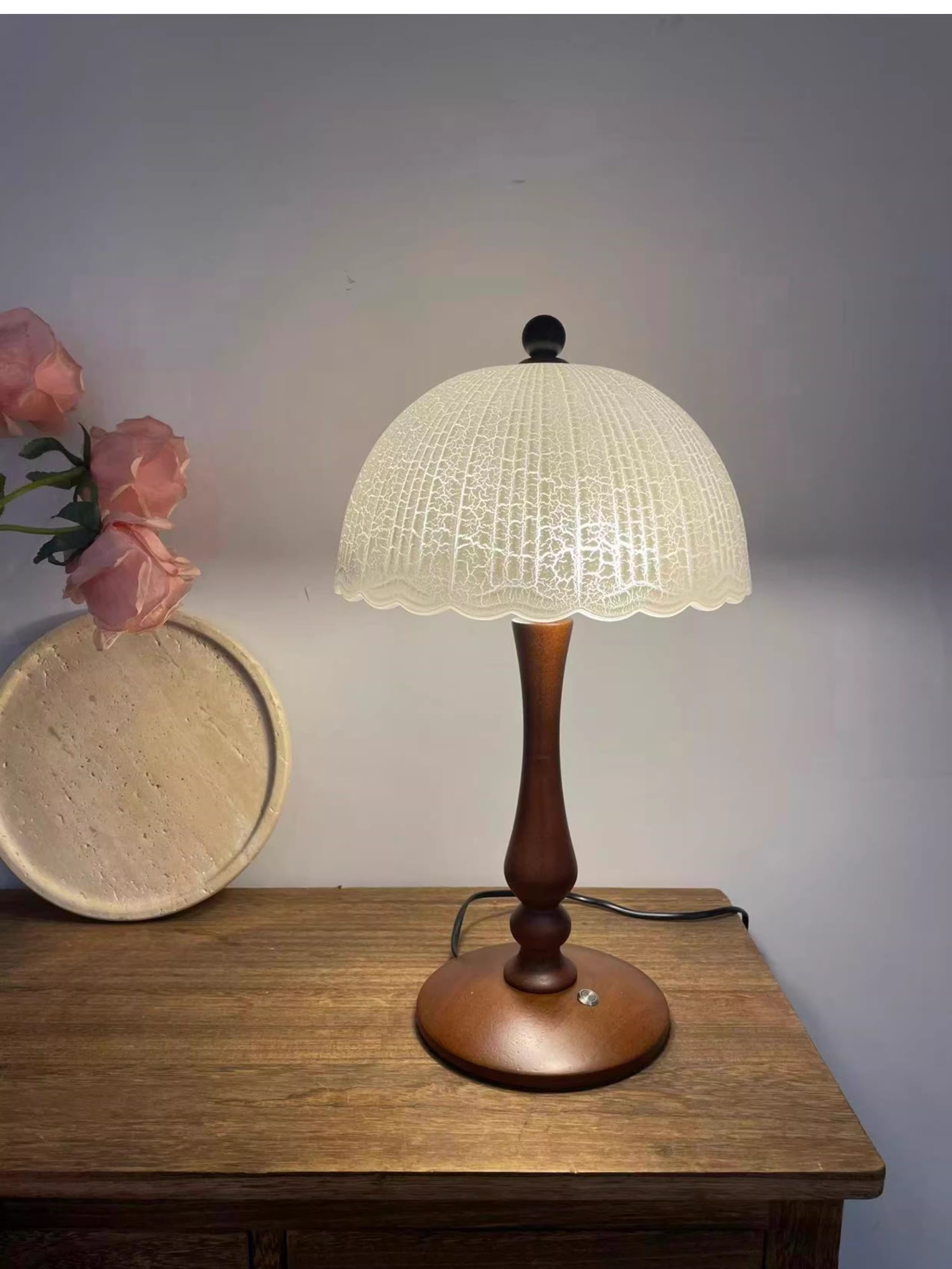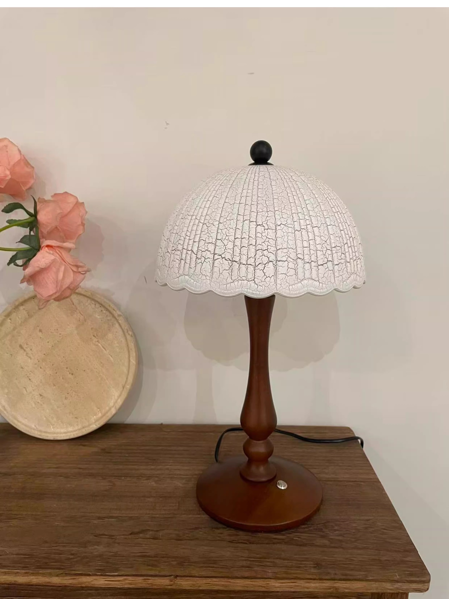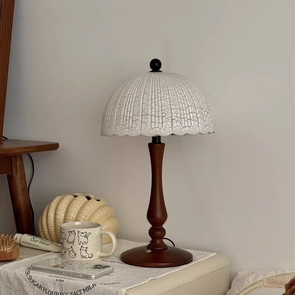 Color Options: Ice-crack Pattern Lampshade Solid Wood Table Lamp – D26*H43cm – Warm Light; Ice-crack Pattern Lampshade Solid Wood Table Lamp – D26*H43cm – Three-Color Dimming