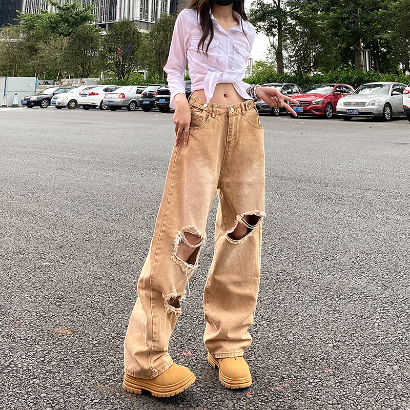 Vintage Washed Worn Khaki Ripped Jeans Women