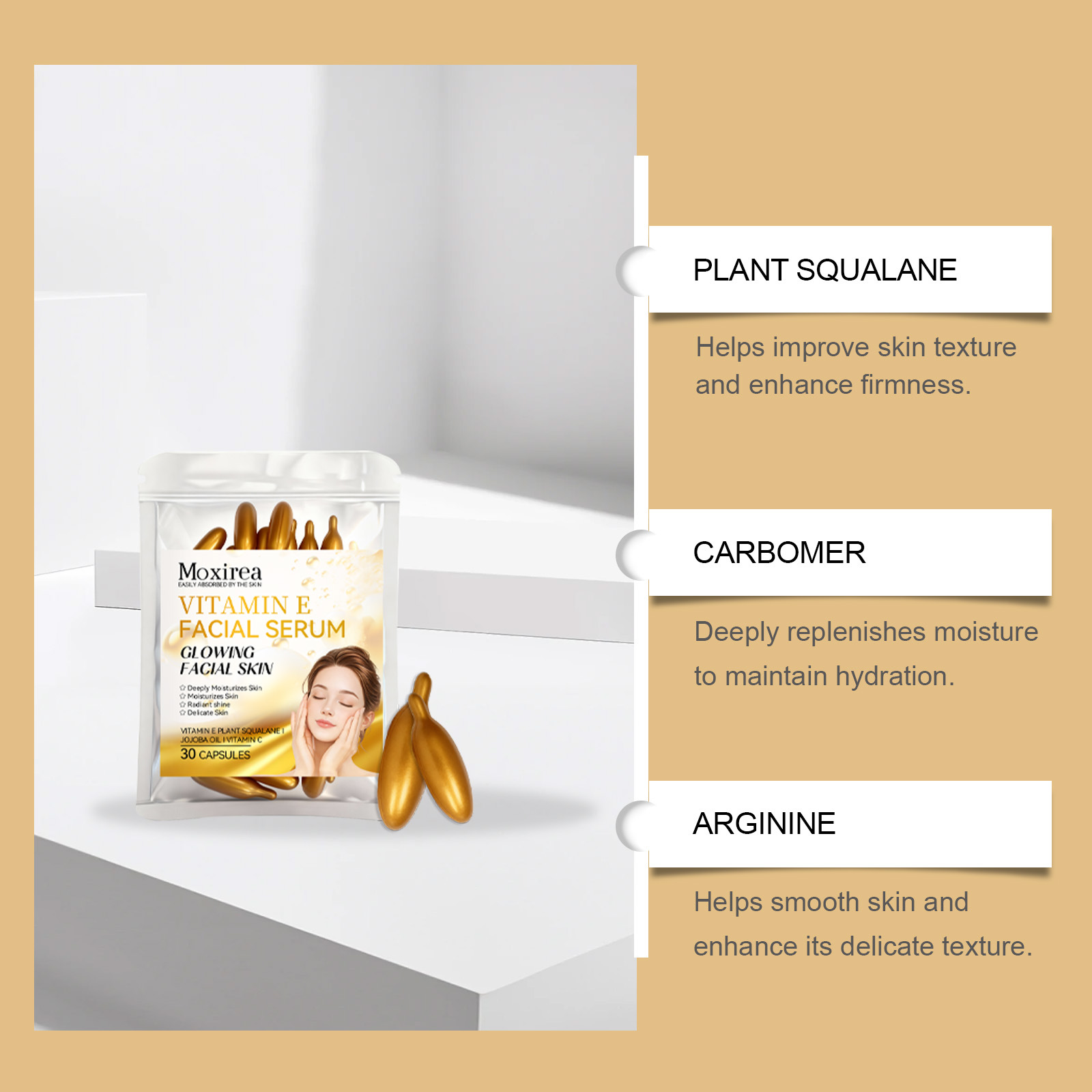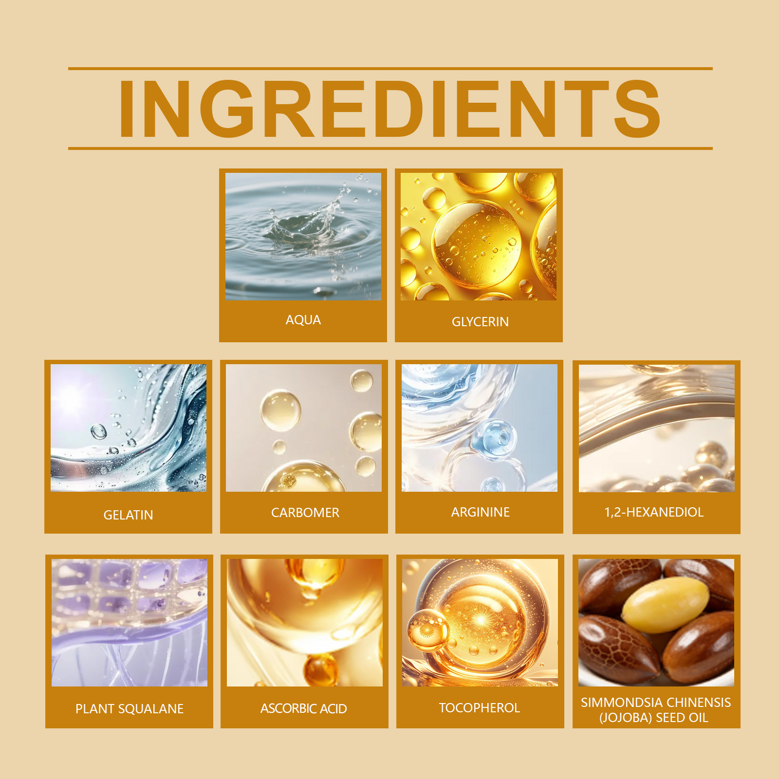 Ingredients: water, glycerin, gelatin, 1,2- hexanediol, carbomer, arginine, plant squalane, ascorbic acid (vitamin C), tocopherol (vitamin E) and jojoba seed oil.