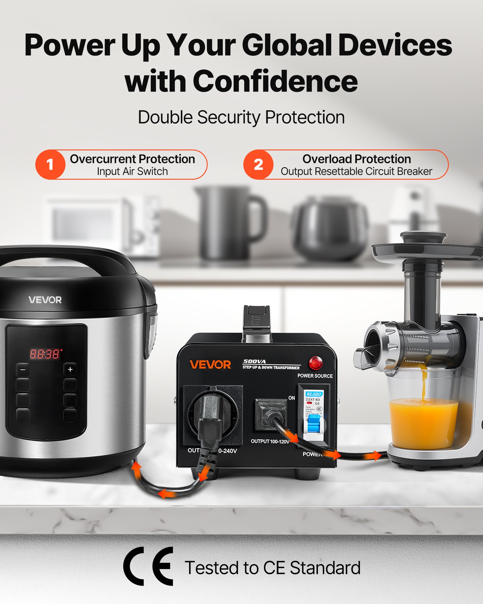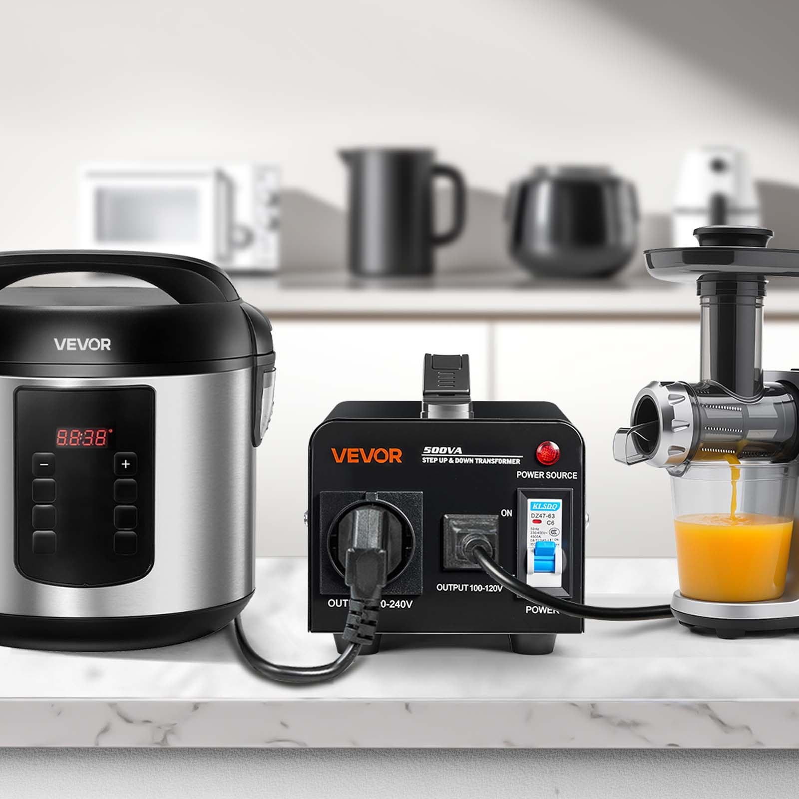 500VA Voltage Converter Transformer: Includes two AC outputs—one standard US output socket and one EU output socket. For optimal results, choose a step up down power converter rated at least 40% higher than your device’s total wattage
